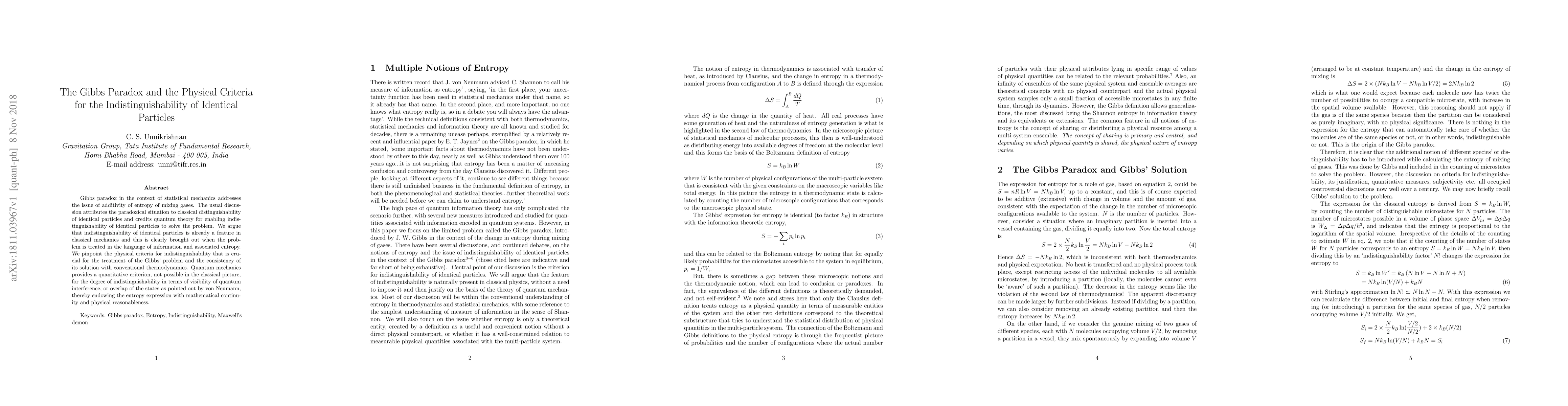 The paper discusses the Gibbs paradox in statistical mechanics, arguing that classical mechanics inherently allows for the indistinguishability of identical particles, contrary to the classical view. It highlights the physical criteria for indistinguishability and emphasizes that quantum mechanics provides a quantitative criterion for this indistinguishability, ensuring consistency with thermodynamics.