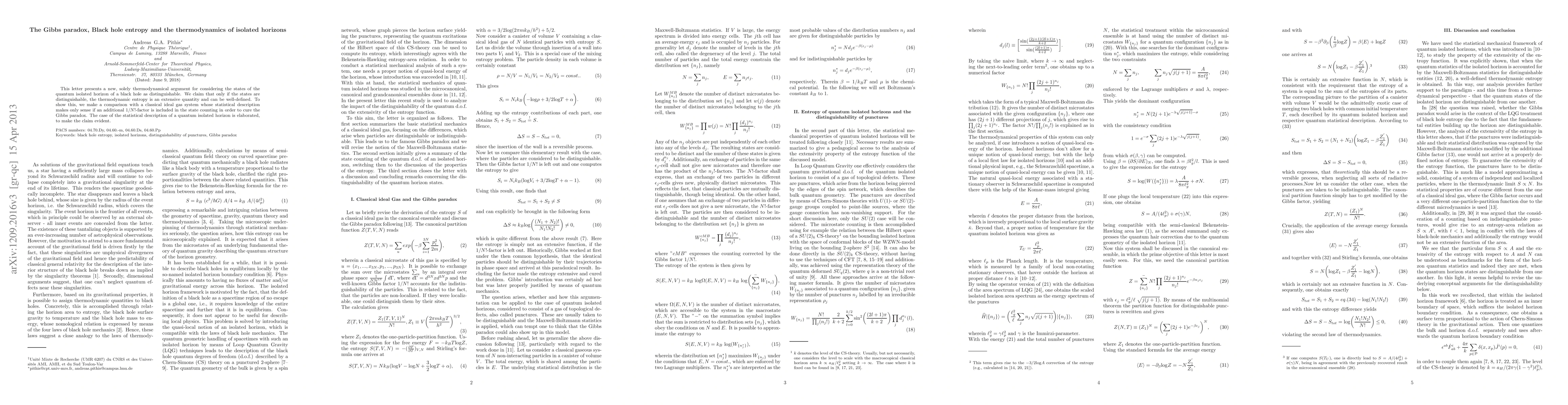 This letter presents a new, solely thermodynamical argument for considering the states of the quantum isolated horizon of a black hole as distinguishable. We claim that only if the states are distinguishable, the thermodynamic entropy is an extensive quantity and can be well-defined. To show this, we make a comparison with a classical ideal gas system whose statistical description makes only sense if an additional 1/N!-factor is included in the state counting in order to cure the Gibbs paradox. The case of the statistical description of a quantum isolated horizon is elaborated, to make the claim evident.