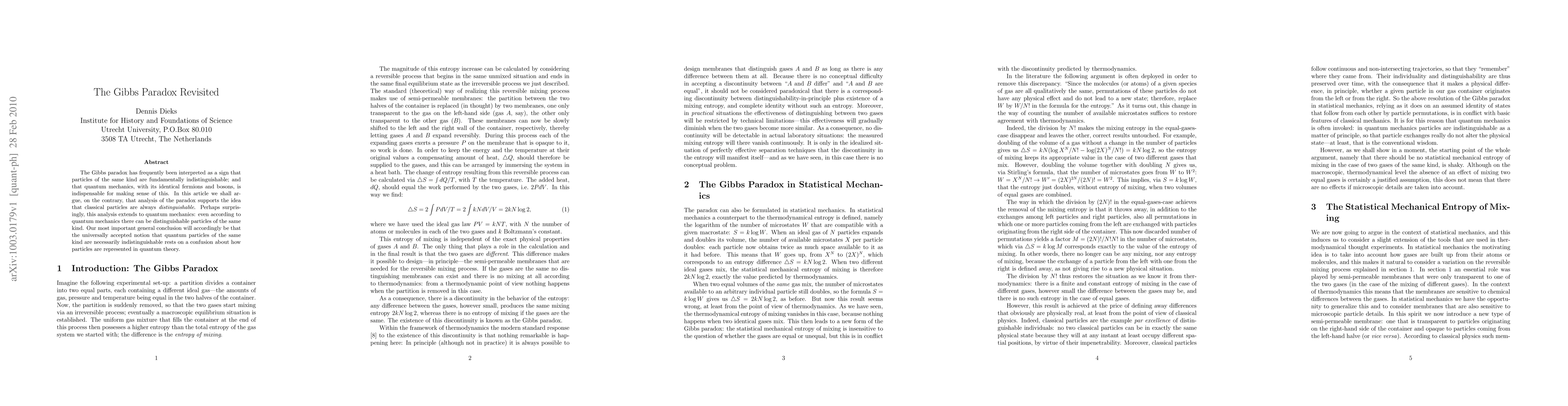 The Gibbs paradox suggests that classical particles are fundamentally distinguishable, contrary to the belief that quantum particles of the same kind must be indistinguishable. This analysis extends to quantum mechanics, indicating that quantum particles can also be distinguishable under certain conditions.