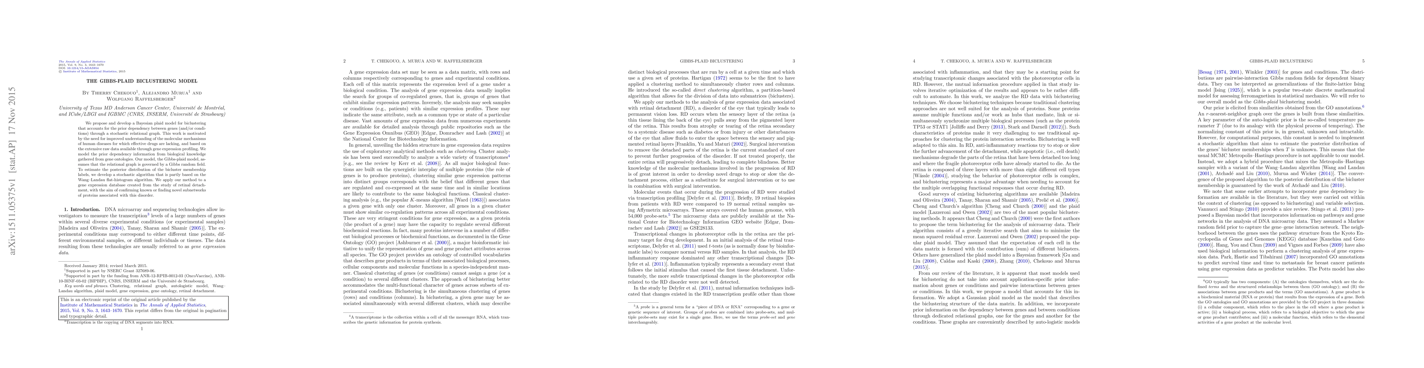 The Gibbs-plaid biclustering model proposes a Bayesian plaid model to identify gene expression subnetworks, incorporating prior dependencies through a relational graph informed by gene ontologies. The model uses a stochastic algorithm based on the Wang-Landau flat-histogram method to estimate bicluster memberships, applied to retinal detachment gene expression data to uncover associated protein subnetworks.