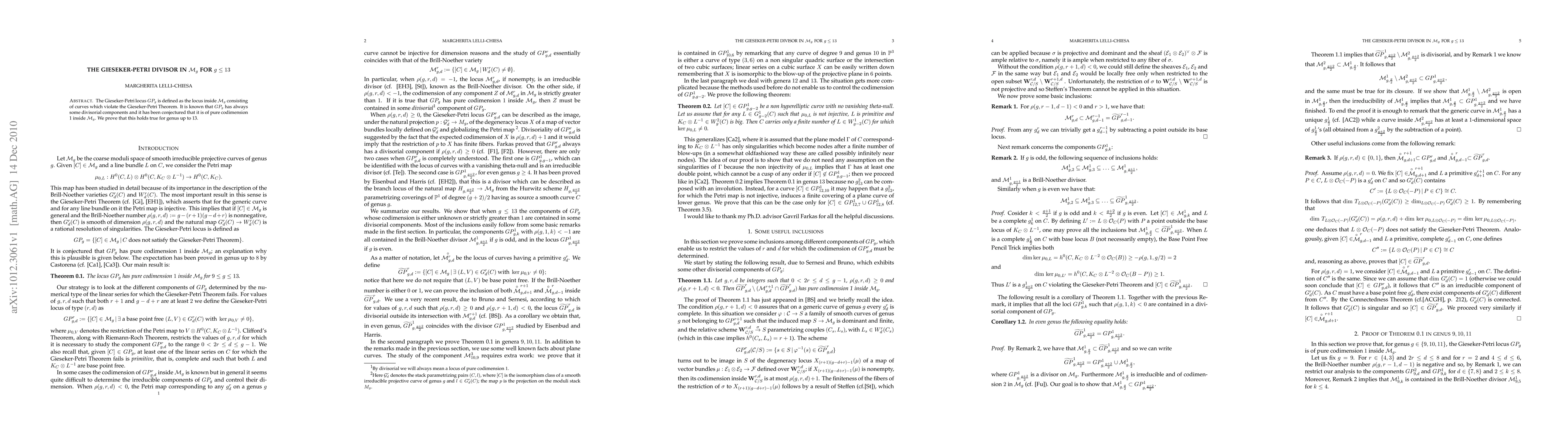 This paper proves that the Gieseker-Petri divisor, which consists of curves in M_g violating the Gieseker-Petri Theorem, has pure codimension 1 for genera up to 13. This supports the conjecture that GP_g is always a divisorial component inside M_g.