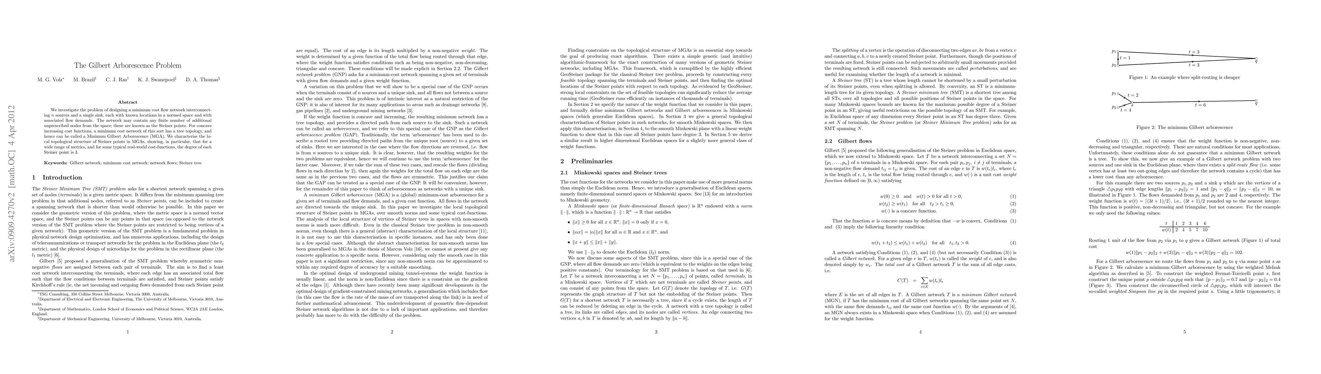 We investigate the problem of designing a minimum cost flow network interconnecting n sources and a single sink, each with known locations in a normed space and with associated flow demands. The network may contain any finite number of additional unprescribed nodes from the space; these are known as the Steiner points. For concave increasing cost functions, a minimum cost network of this sort has a tree topology, and hence can be called a Minimum Gilbert Arborescence (MGA). We characterise the local topological structure of Steiner points in MGAs, showing, in particular, that for a wide range of metrics, and for some typical real-world cost-functions, the degree of each Steiner point is 3.