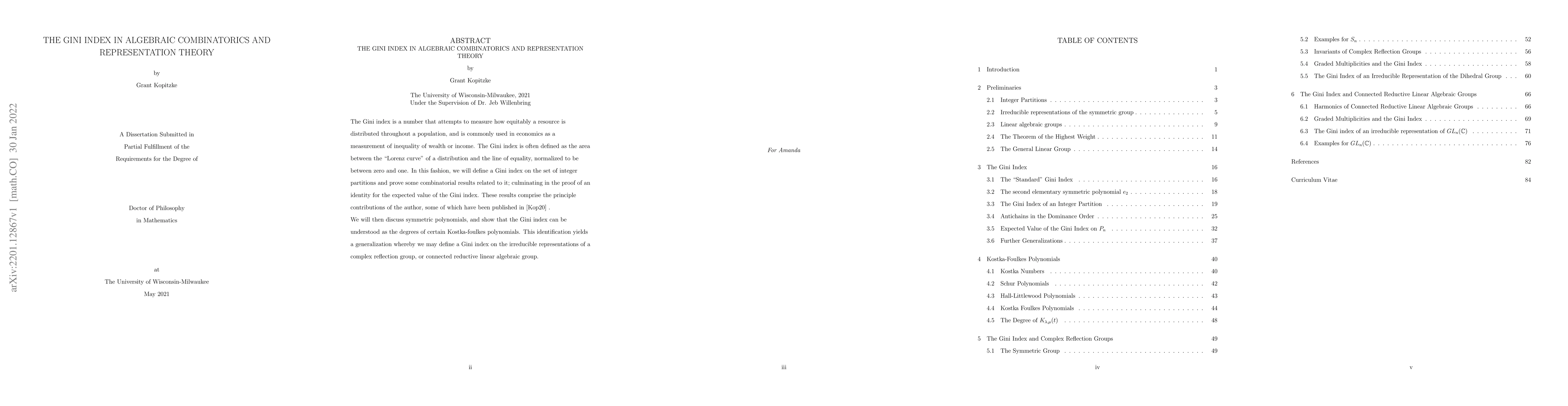The Gini index is a number that attempts to measure how equitably a resource is distributed throughout a population, and is commonly used in economics as a measurement of inequality of wealth or income. The Gini index is often defined as the area between the "Lorenz curve" of a distribution and the line of equality, normalized to be between zero and one. In this fashion, we will define a Gini index on the set of integer partitions and prove some combinatorial results related to it; culminating in the proof of an identity for the expected value of the Gini index. We will then discuss symmetric polynomials, and show that the Gini index can be understood as the degrees of certain Kostka-foulkes polynomials. This identification yields a generalization whereby we may define a Gini index on the irreducible representations of a complex reflection group, or connected reductive linear algebraic group.