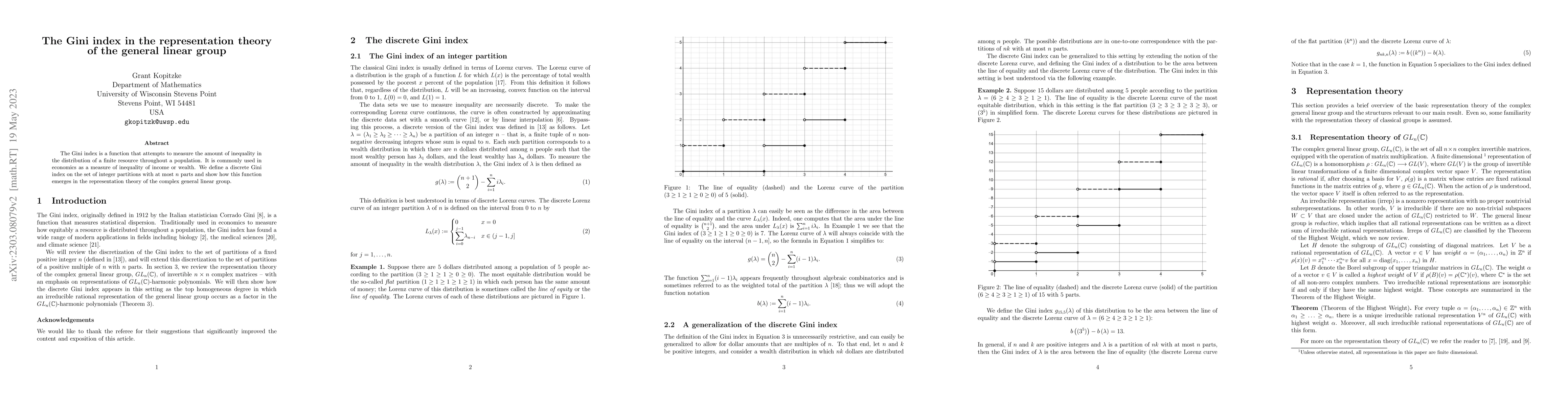 This paper defines a discrete Gini index for integer partitions with at most $n$ parts and demonstrates its relevance in the representation theory of the complex general linear group. The Gini index, traditionally used to measure economic inequality, is shown to emerge in the context of group representations.
