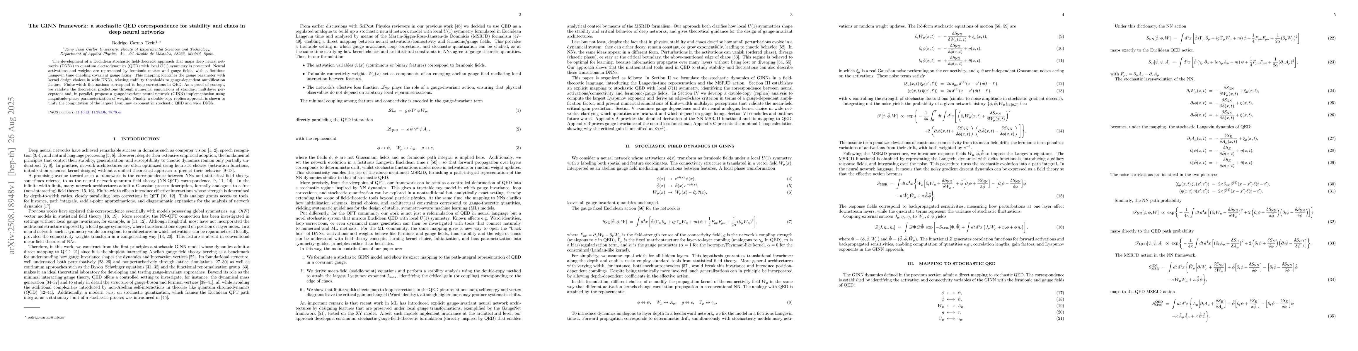 The development of a Euclidean stochastic field-theoretic approach that maps deep neural networks (DNNs) to quantum electrodynamics (QED) with local U(1) symmetry is presented. Neural activations and weights are represented by fermionic matter and gauge fields, with a fictitious Langevin time enabling covariant gauge fixing. This mapping identifies the gauge parameter with kernel design choices in wide DNNs, relating stability thresholds to gauge-dependent amplification factors. Finite-width fluctuations correspond to loop corrections in QED. As a proof of concept, we validate the theoretical predictions through numerical simulations of standard multilayer perceptrons and, in parallel, propose a gauge-invariant neural network (GINN) implementation using magnitude--phase parameterization of weights. Finally, a double-copy replica approach is shown to unify the computation of the largest Lyapunov exponent in stochastic QED and wide DNNs.