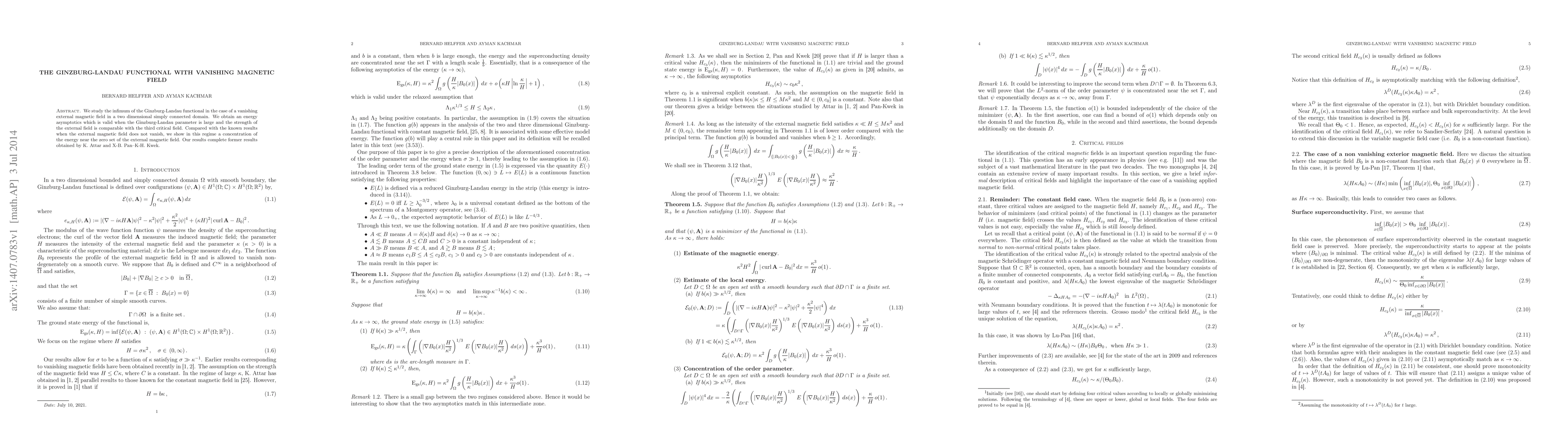 This paper investigates the infimum of the Ginzburg-Landau functional in two-dimensional, simply connected domains under a vanishing external magnetic field, revealing energy concentration near the zero set of the field when the Ginzburg-Landau parameter is large. The findings complement previous results by Attar, Pan, and Kwek.