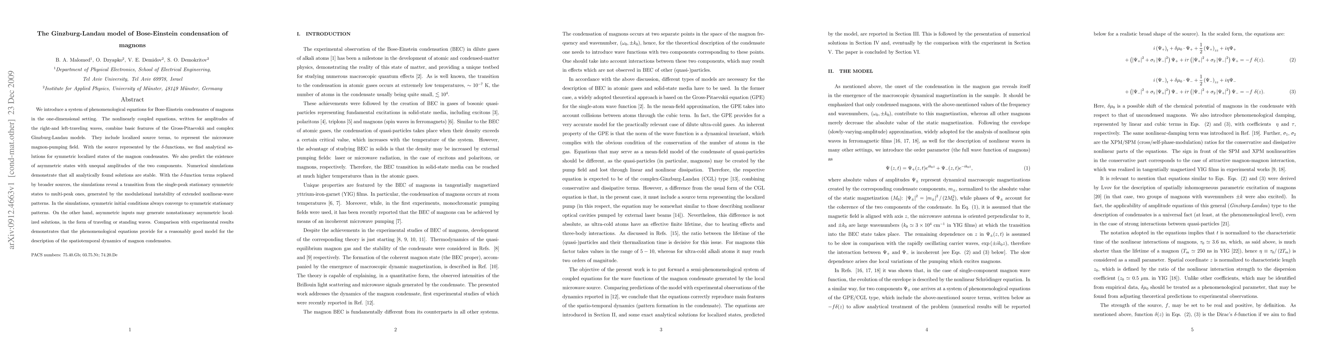 This paper develops a phenomenological model for magnon Bose-Einstein condensates in one dimension, combining features of the Gross-Pitaevskii and Ginzburg-Landau models. Analytical solutions reveal stable symmetric and asymmetric localized states, with numerical simulations showing transitions to multi-peak patterns due to modulational instability.
