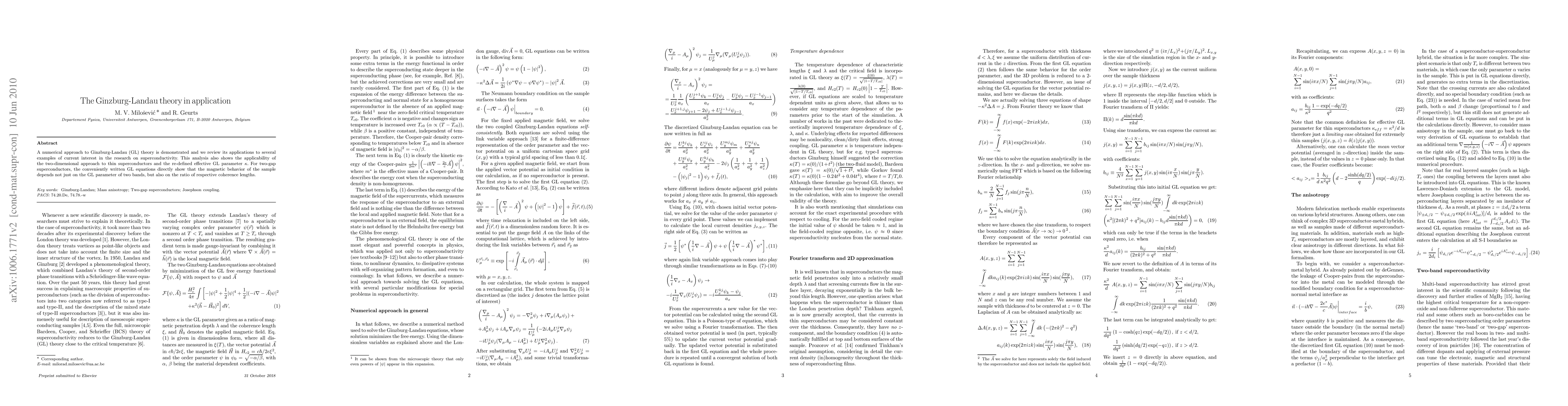 A numerical approach to Ginzburg-Landau (GL) theory is demonstrated and we review its applications to several examples of current interest in the research on superconductivity. This analysis also shows the applicability of the two-dimensional approach to thin superconductors and the re-defined effective GL parameter kappa. For two-gap superconductors, the conveniently written GL equations directly show that the magnetic behavior of the sample depends not just on the GL parameter of two bands, but also on the ratio of respective coherence lengths.