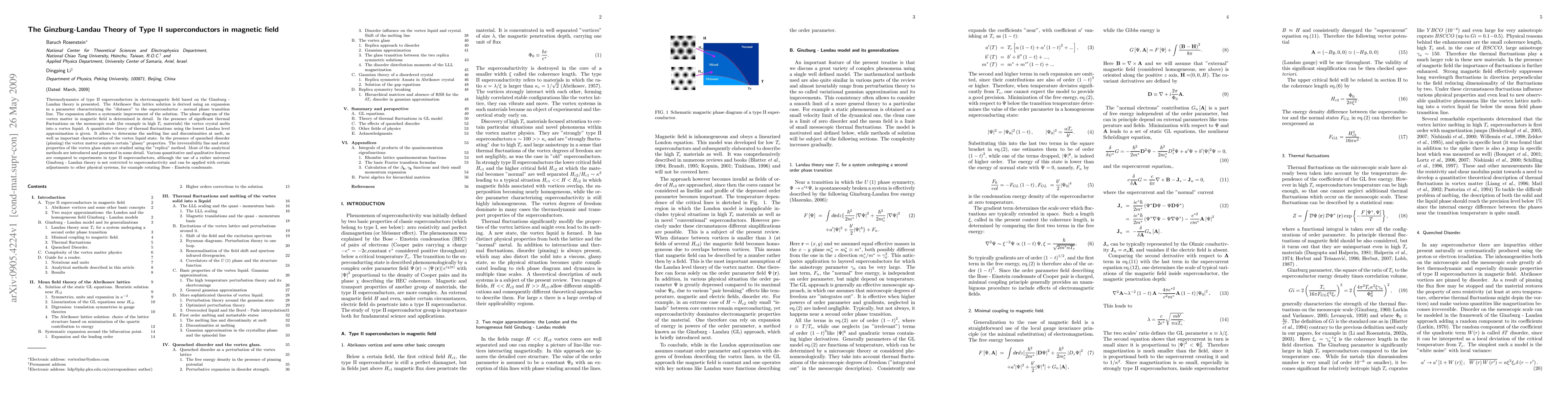 This paper develops the Ginzburg-Landau theory for type II superconductors in magnetic fields, deriving the Abrikosov flux lattice solution and detailing the phase diagram of vortex matter. It quantitatively analyzes thermal fluctuations and the vortex liquid state, while also exploring the vortex glass behavior under quenched disorder.