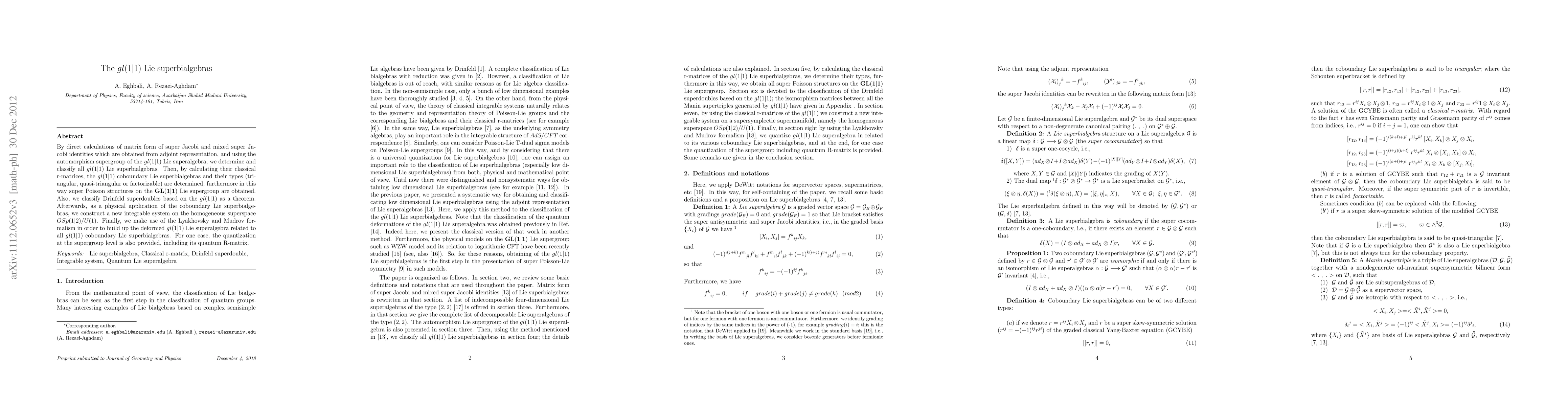 By direct calculations of matrix form of super Jacobi and mixed super Jacobi identities which are obtained from adjoint representation, and using the automorphism supergroup of the gl(1|1) Lie superalgebra, we determine and classify all gl(1|1) Lie superbialgebras. Then, by calculating their classical r-matrices, the gl(1j1) coboundary Lie superbialgebras and their types (triangular, quasi-triangular or factorizable) are determined, furthermore in this way super Poisson structures on the GL(1|1) Lie supergroup are obtained. Also, we classify Drinfeld superdoubles based on the gl(1|1) as a theorem. Afterwards, as a physical application of the coboundary Lie superbialgebras, we construct a new integrable system on the homogeneous superspace OSp(1|2)/U(1). Finally, we make use of the Lyakhovsky and Mudrov formalism in order to build up the deformed gl(1|1) Lie superalgebra related to all gl(1|1) coboundary Lie superbialgebras. For one case, the quantization at the supergroup level is also provided, including its quantum R-matrix.