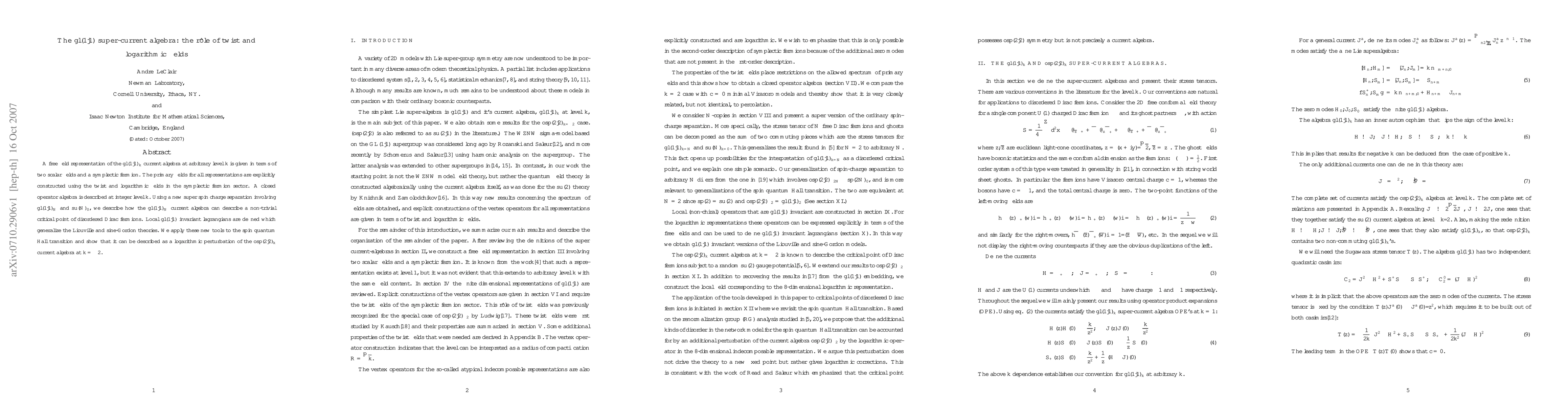 A free field representation of the gl(1|1)_k current algebra at arbitrary level k is given in terms of two scalar fields and a symplectic fermion. The primary fields for all representations are explicitly constructed using the twist and logarithmic fields in the symplectic fermion sector. A closed operator algebra is described at integer level k. Using a new super spin charge separation involving gl(1|1)_N and su(N)_0, we describe how the gl(1|1)_N current algebra can describe a non-trivial critical point of disordered Dirac fermions. Local gl(1|1) invariant lagrangians are defined which generalize the Liouville and sine-Gordon theories. We apply these new tools to the spin quantum Hall transition and show that it can be described as a logarithmic perturbation of the osp(2|2)_k current algebra at k=-2.
