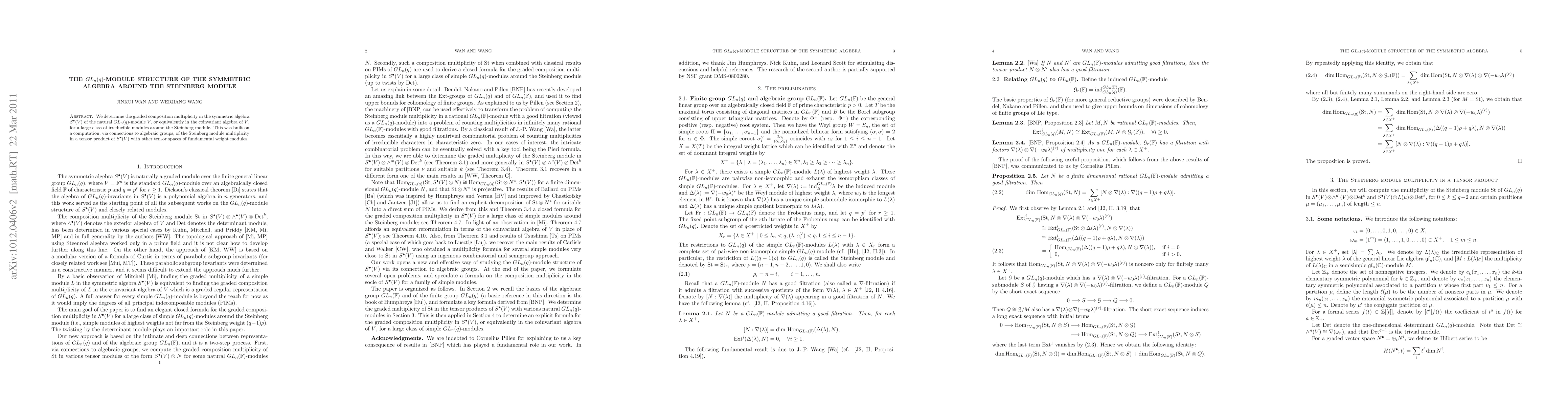 Summary: This paper determines the graded composition multiplicity in the symmetric algebra of the natural GL_n(q)-module V, focusing on a large class of irreducible modules around the Steinberg module, based on computations linking algebraic groups and tensor products of fundamental weight modules.