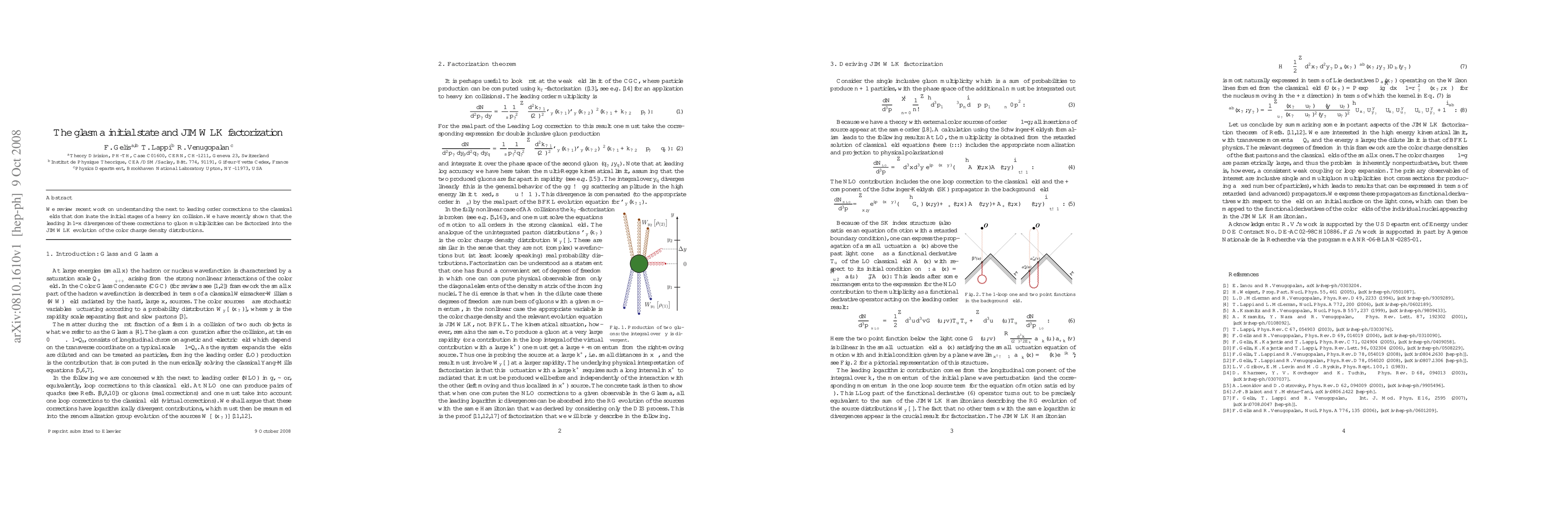 This paper reviews next-to-leading order corrections to classical fields in heavy ion collisions, demonstrating that leading ln(1/x) divergences in gluon multiplicities factorize through the JIMWLK evolution of color charge density distributions.