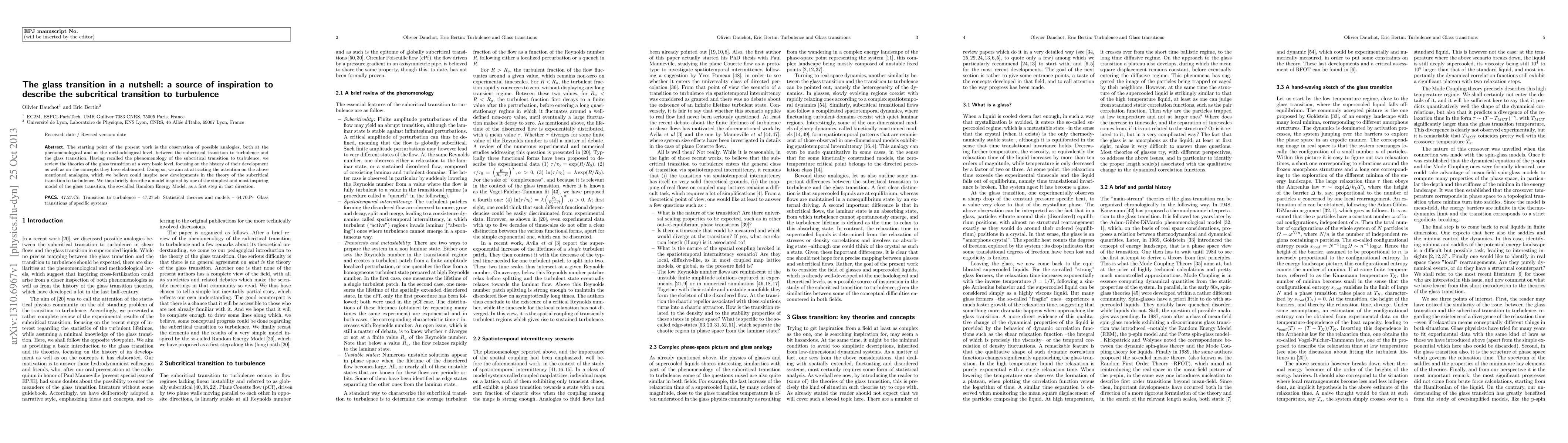 This paper explores analogies between the subcritical transition to turbulence and the glass transition, aiming to inspire new theoretical developments in turbulence. It reviews basic concepts of glass transition theories and proposes a model inspired by the Random Energy Model to initiate this new direction.