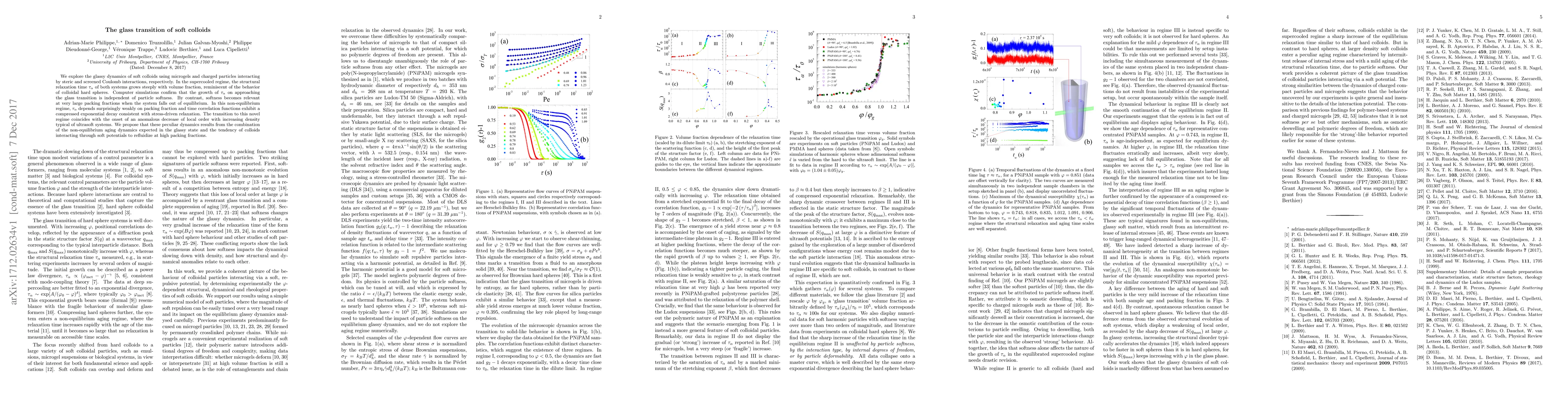 This paper investigates the glass transition behavior of soft colloids, finding that their structural relaxation time grows similarly to hard spheres as volume fraction increases. It reveals that particle softness becomes significant only at very high packing fractions, where the system exhibits non-equilibrium dynamics and a compressed exponential decay in time correlation functions.