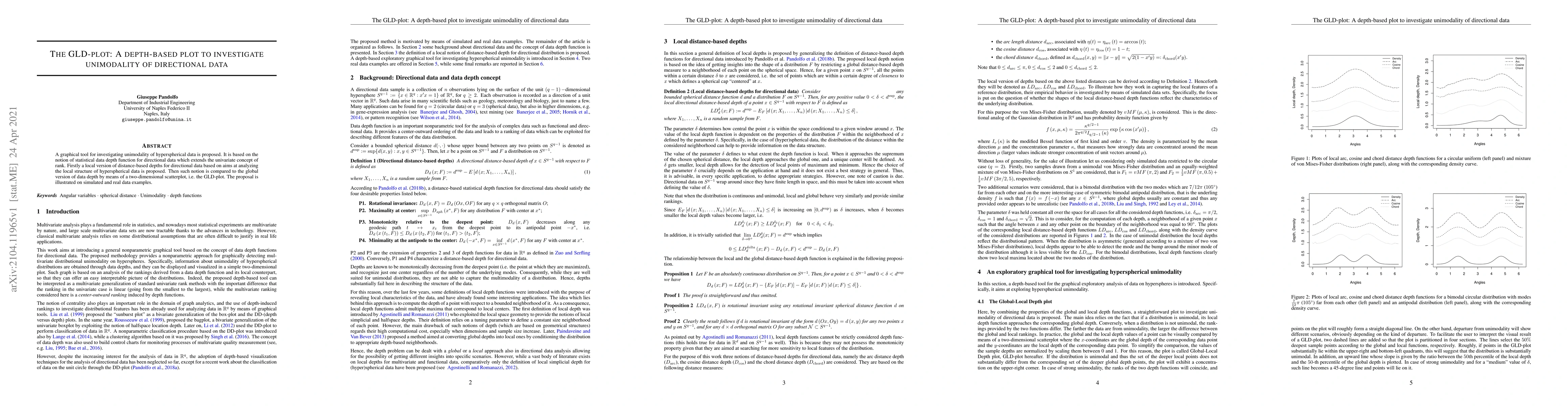 The paper introduces the GLD-plot, a depth-based graphical tool for assessing unimodality in hyperspherical directional data. It compares local and global depth functions through a two-dimensional scatterplot and demonstrates its utility with simulated and real data examples.
