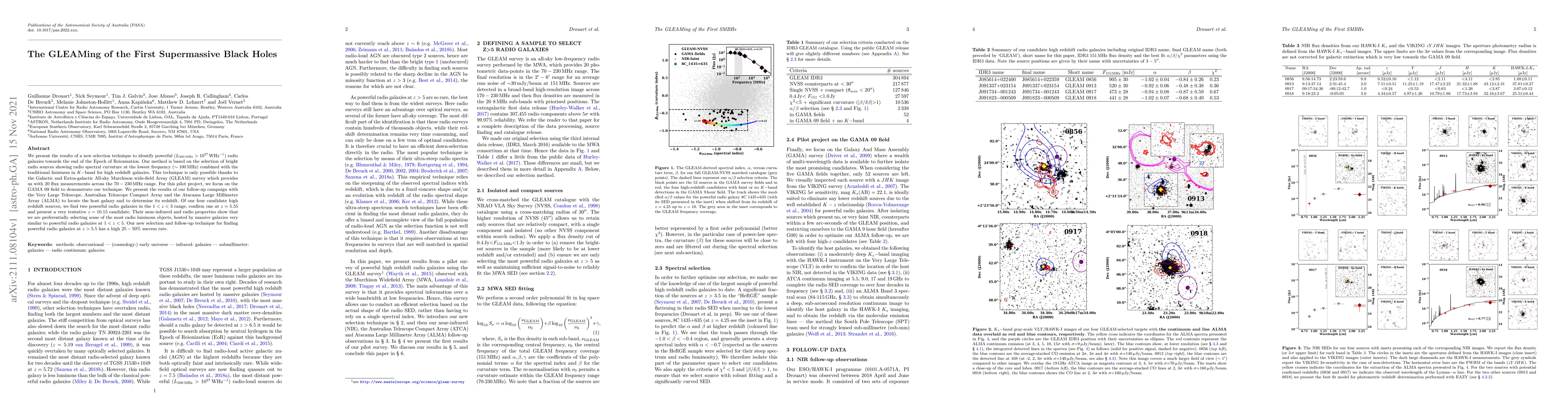 This paper introduces a novel selection technique to identify powerful radio galaxies at the end of the Epoch of Reionisation, utilizing the GLEAM survey's low-frequency radio data. The technique successfully identifies high-redshift radio galaxies, confirming two at $z=1<z<3$ and presenting a candidate at $z=10.15$.