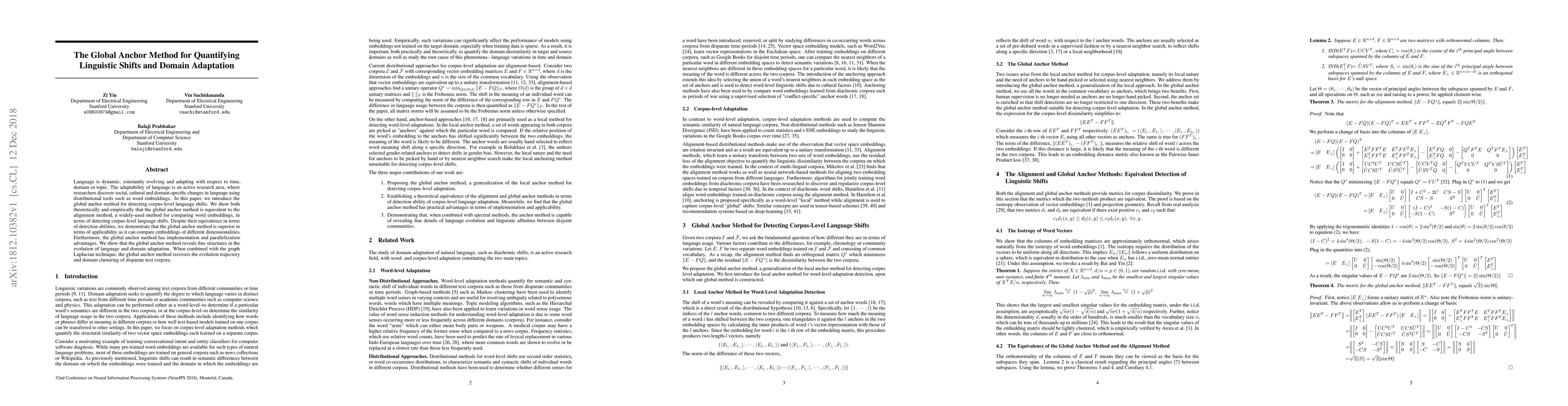 A new method called the Global Anchor Method detects language shifts in text corpora with improved applicability and efficiency than existing methods. It reveals fine structures in language evolution and can recover domain clustering from disparate texts.