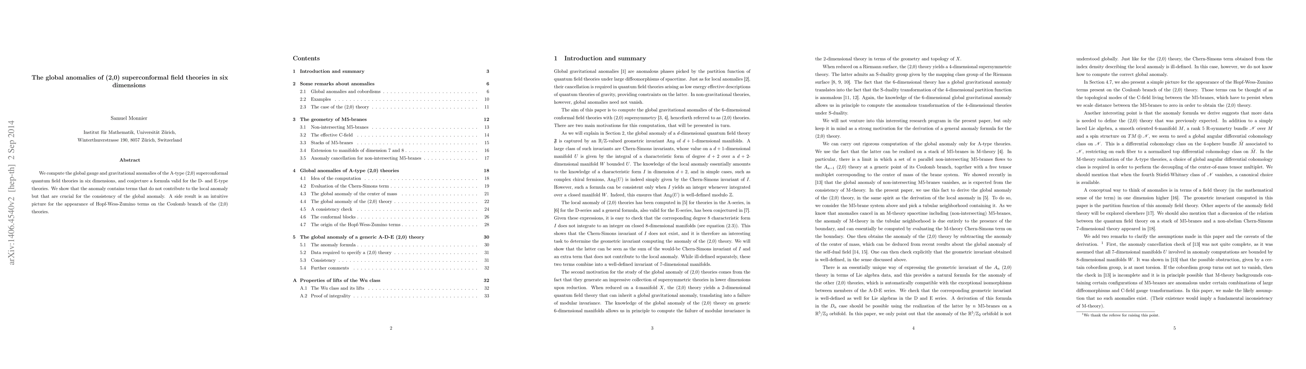 We compute the global gauge and gravitational anomalies of the A-type (2,0) superconformal quantum field theories in six dimensions, and conjecture a formula valid for the D- and E-type theories. We show that the anomaly contains terms that do not contribute to the local anomaly but that are crucial for the consistency of the global anomaly. A side result is an intuitive picture for the appearance of Hopf-Wess-Zumino terms on the Coulomb branch of the (2,0) theories.