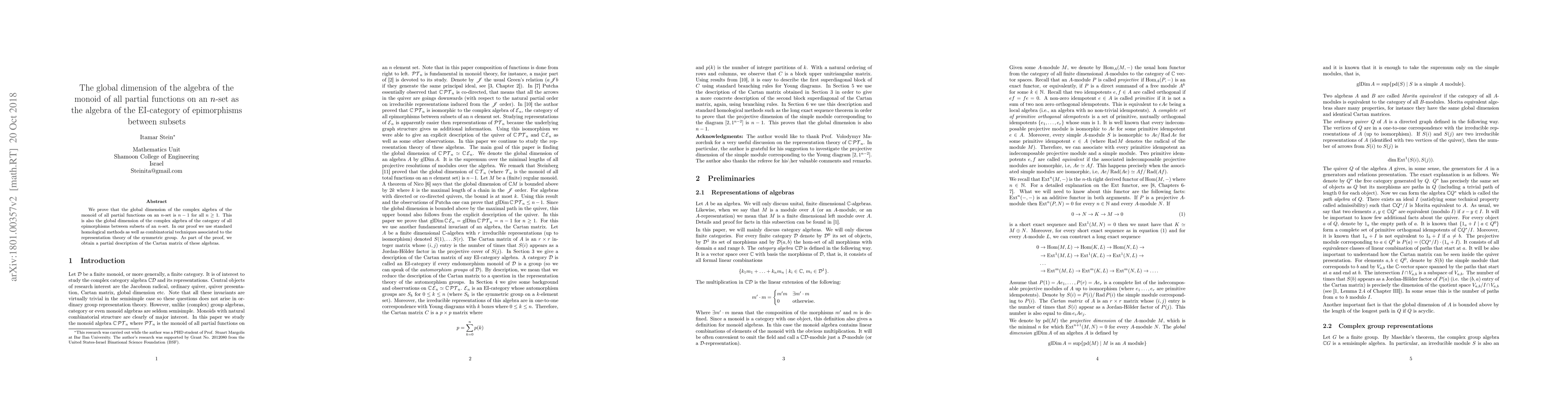 We prove that the global dimension of the complex algebra of the monoid of all partial functions on an n-set is $n-1$ for all $n\geq 1$. This is also the global dimension of the complex algebra of the category of all epimorphisms between subsets of an $n$-set. In our proof we use standard homological methods as well as combinatorial techniques associated to the representation theory of the symmetric group. As part of the proof, we obtain a partial description of the Cartan matrix of these algebras.