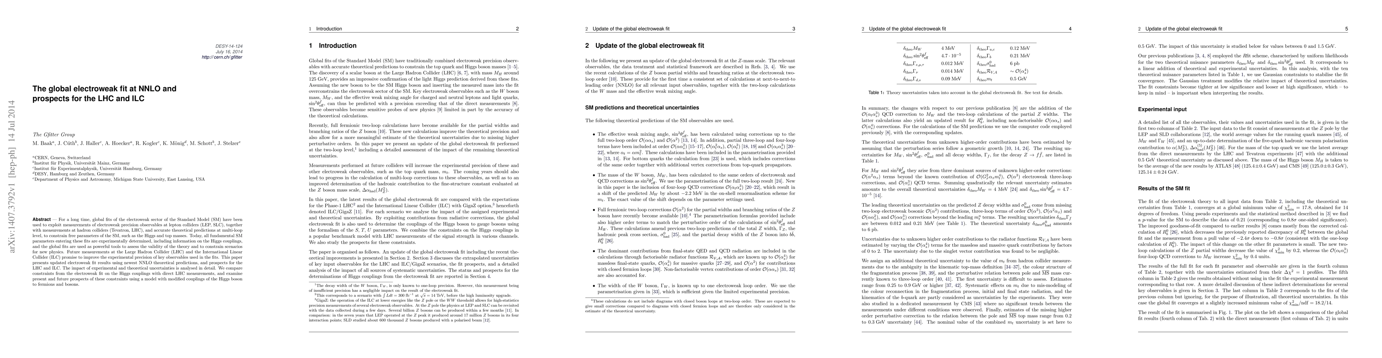 This paper updates global electroweak fits of the Standard Model using the latest NNLO theoretical predictions, assessing the validity of the theory and constraining new physics scenarios. It also examines future prospects for the LHC and ILC to improve experimental precision and compares current electroweak fit constraints on Higgs couplings with direct LHC measurements.