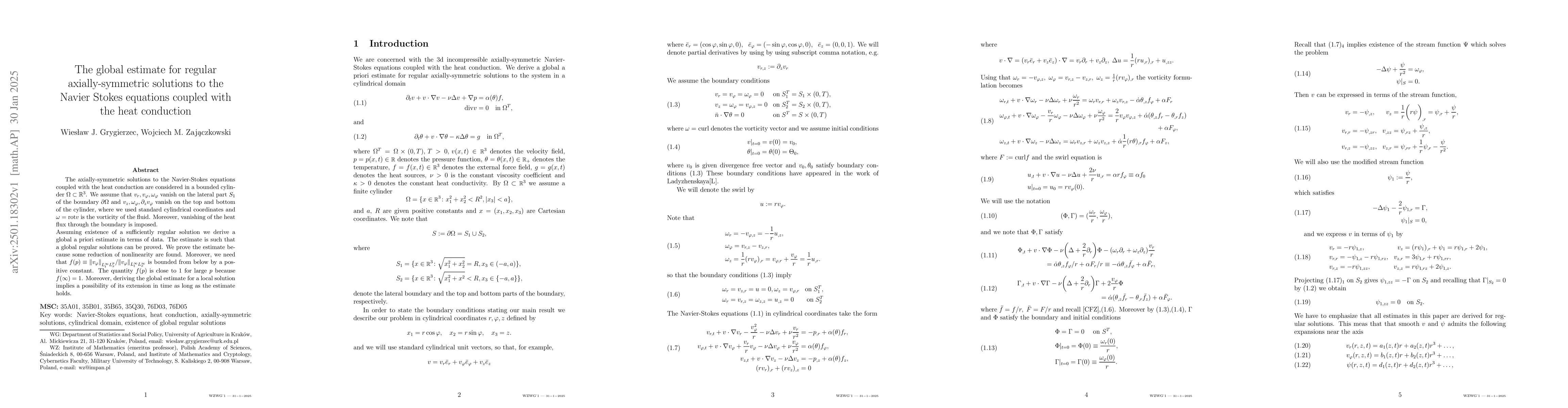 The paper presents a detailed derivation of global energy estimates for regular axially-symmetric solutions to the Navier-Stokes equations coupled with heat conduction, introducing novel reduction techniques for nonlinear terms.