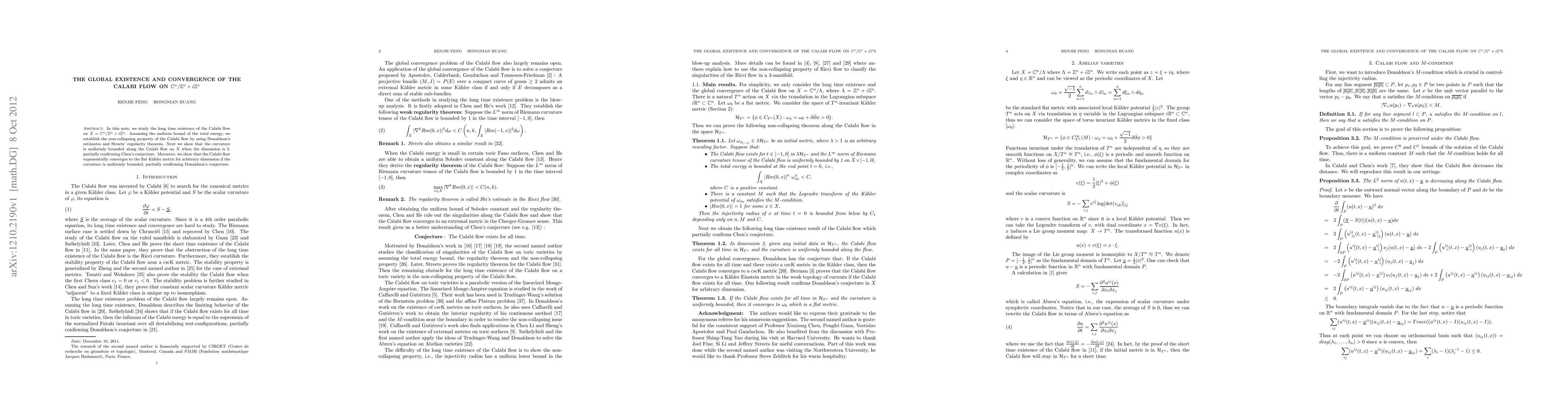 In this note, we study the long time existence of the Calabi flow on $X = \mathbb{C}^n/\mathbb{Z}^n + i\mathbb{Z}^n$. Assuming the uniform bound of the total energy, we establish the non-collapsing property of the Calabi flow by using Donaldson's estimates and Streets' regularity theorem. Next we show that the curvature is uniformly bounded along the Calabi flow on $X$ when the dimension is 2, partially confirming Chen's conjecture. Moreover, we show that the Calabi flow exponentially converges to the flat K\"ahler metric for arbitrary dimension if the curvature is uniformly bounded, partially confirming Donaldson's conjecture.
