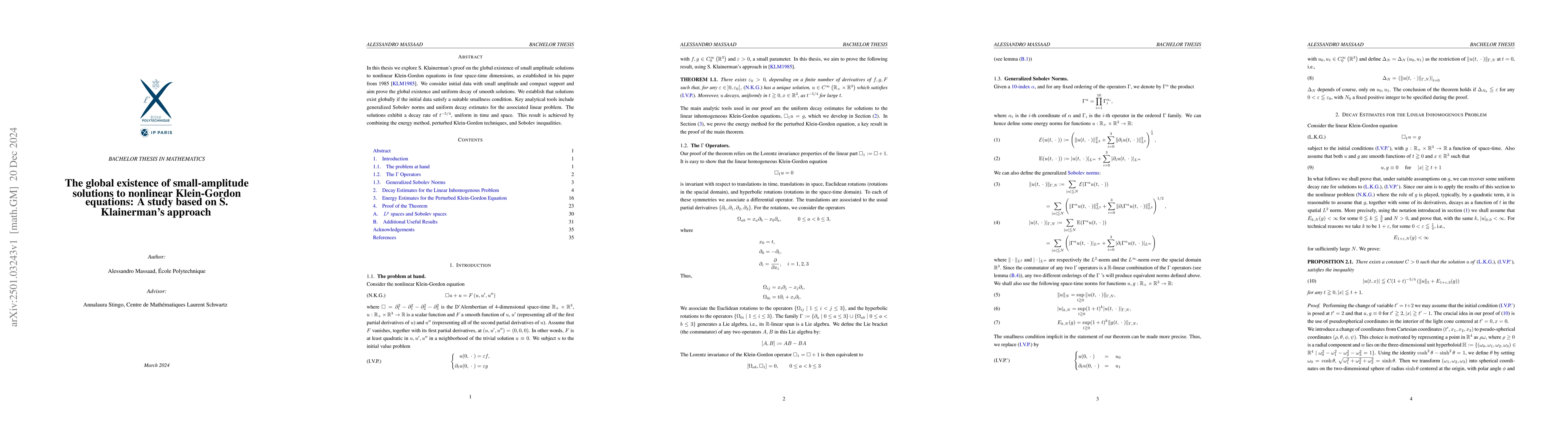 This paper investigates the global existence of small-amplitude solutions to nonlinear Klein-Gordon equations using Klainerman's 1985 proof. It proves global existence and uniform decay of solutions for initial data with small amplitude, utilizing Sobolev norms and decay estimates, with a decay rate of $t^{-5/4}$.