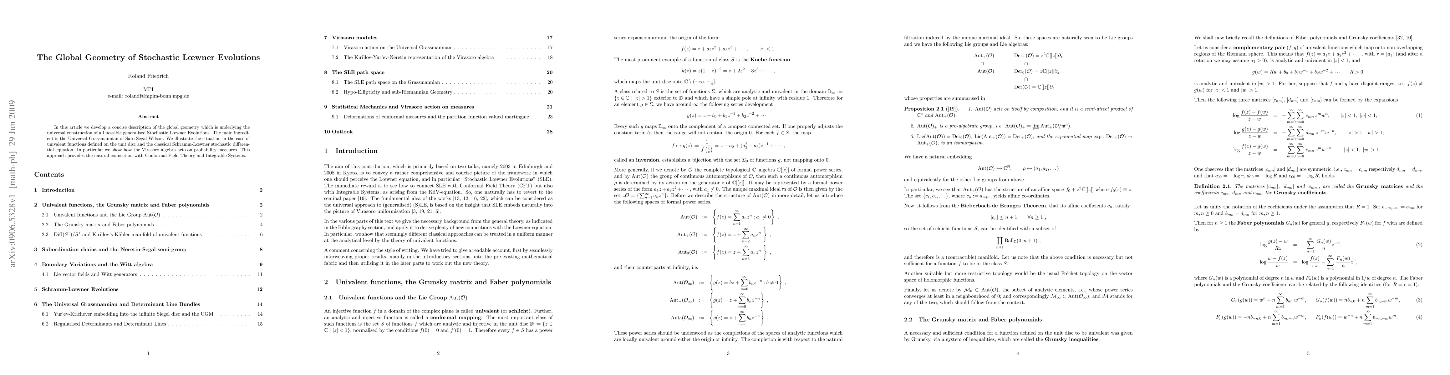 This paper develops a global geometric framework for generalized Stochastic L{\"o}wner Evolutions, utilizing the Universal Grassmannian of Sato-Segal-Wilson. It demonstrates the Virasoro algebra's action on probability measures and links this to Conformal Field Theory and Integrable Systems through univalent functions on the unit disc.