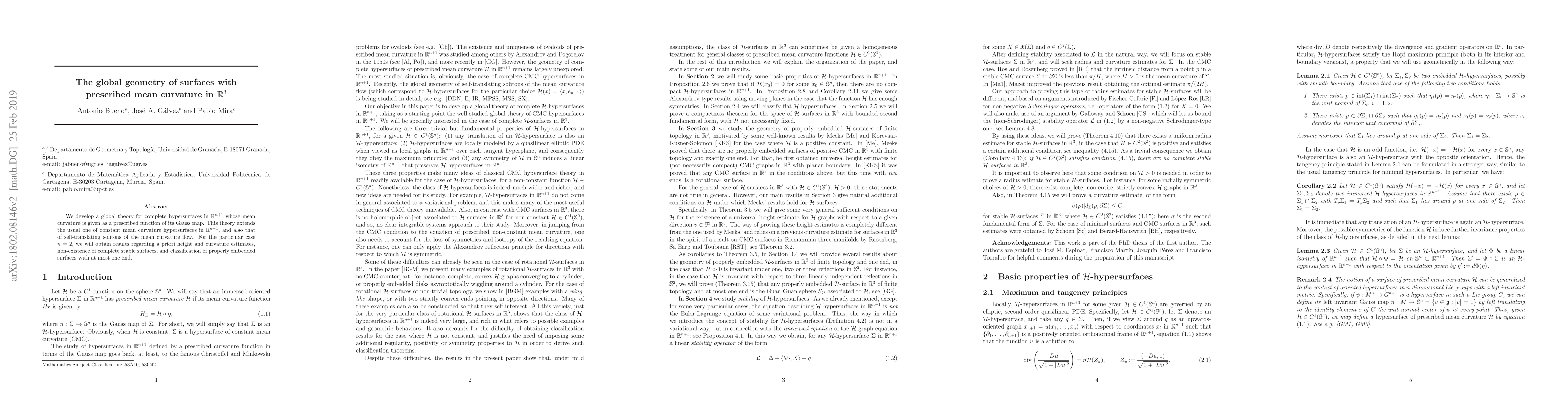 This research extends existing theories and provides new insights into the global geometry of surfaces with prescribed mean curvature in $\mathbb{R}^3$, impacting the understanding of hypersurface properties in higher dimensions.