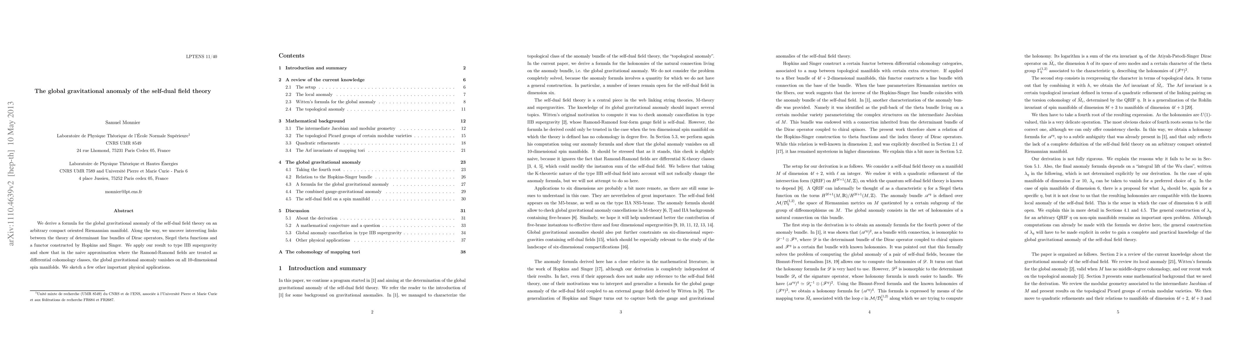 Researchers derived a formula for the global gravitational anomaly in self-dual field theory, showing it vanishes on 10-dimensional spin manifolds when approximated as differential cohomology classes.
