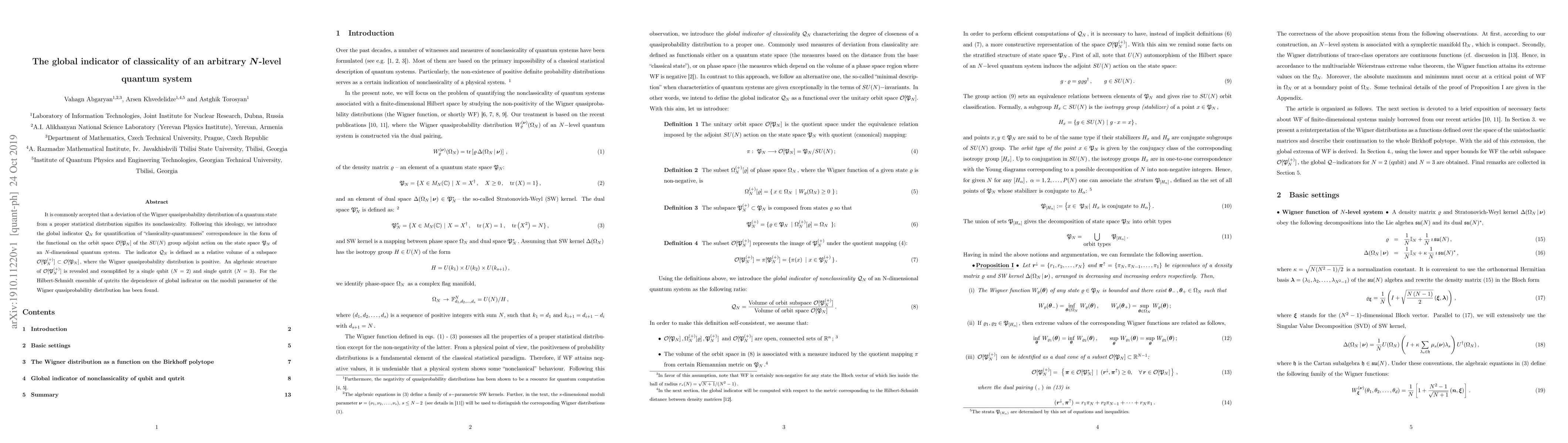 This paper introduces a global indicator $\mathcal{Q}_N$ to quantify the classicality of an $N$-level quantum system by measuring the positivity of its Wigner quasiprobability distribution. The indicator is defined as the relative volume of the subspace where the distribution is positive, and its algebraic structure is demonstrated through examples of qubits and qutrits.