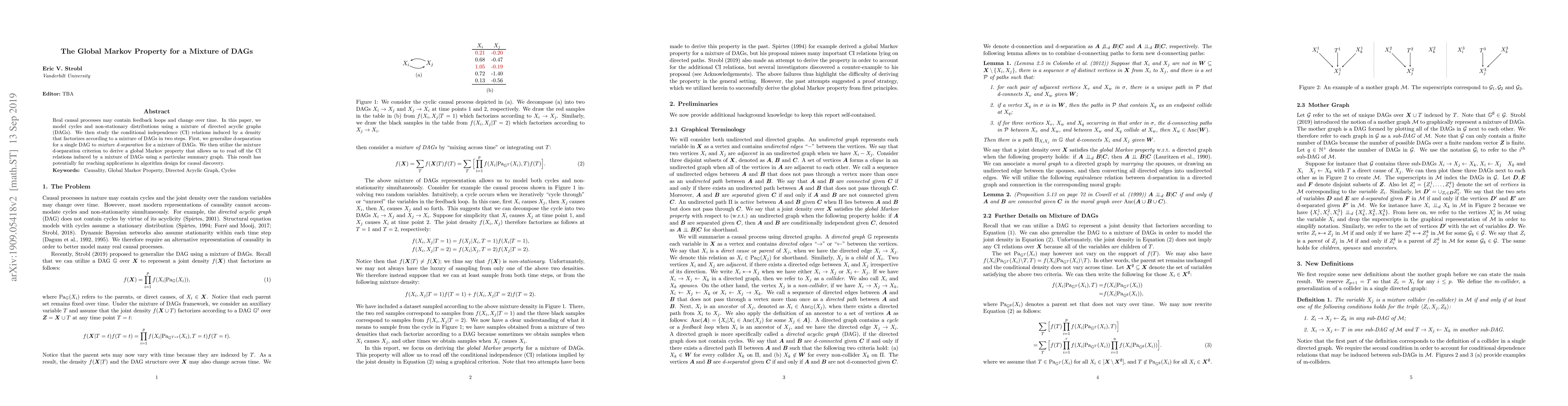 This paper models causal processes with feedback loops and non-stationary distributions using a mixture of directed acyclic graphs (DAGs). It generalizes d-separation for a global Markov property, enabling the derivation of conditional independence relations from a mixture of DAGs, which has significant implications for causal discovery algorithms.
