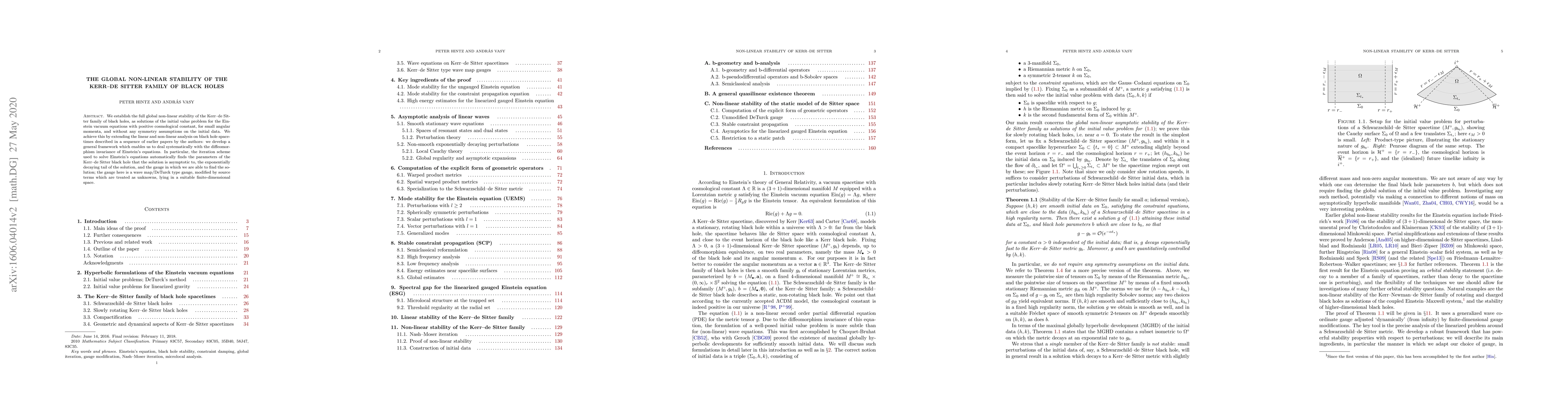 This paper establishes the global non-linear stability of the Kerr-de Sitter black holes under the Einstein vacuum equations with a positive cosmological constant, for small angular momenta, without symmetry assumptions on initial data. The authors develop a new framework to handle the diffeomorphism invariance and utilize an iteration scheme to find the parameters and gauge of the solution.