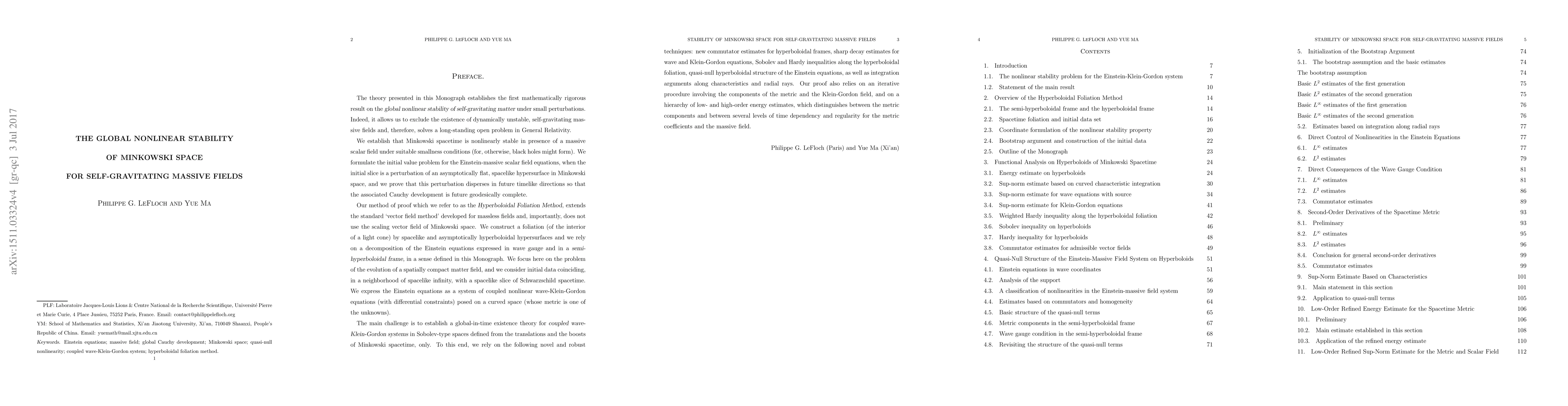 The theory presented in this monograph establishes the first mathematically rigorous result on the global nonlinear stability of self-gravitating matter under small perturbations of an asymptotically flat, spacelike hypersurface of Minkowski spacetime. It allows one to exclude the existence of dynamically unstable, self-gravitating massive fields and, therefore, solves a long-standing open problem in General Relativity. By a significant extension of the Hyperboloidal Foliation Method they introduced in 2014, the authors establish global-in-time existence for the Einstein equations expressed as a coupled wave-Klein-Gordon system of partial differential equations. The metric and matter fields are sought for in Sobolev-type functional spaces, suitably defined from the translations and the boosts of Minkowski spacetime.