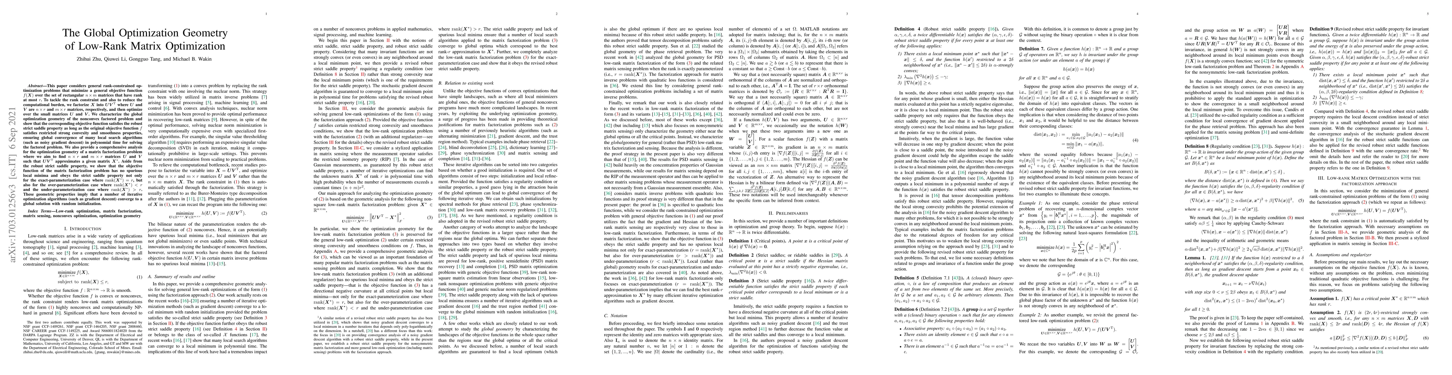 This paper explores global optimization geometry for low-rank matrix optimization problems, showing that factorization can reduce computational burden and enable convergence of many local search algorithms in polynomial time.