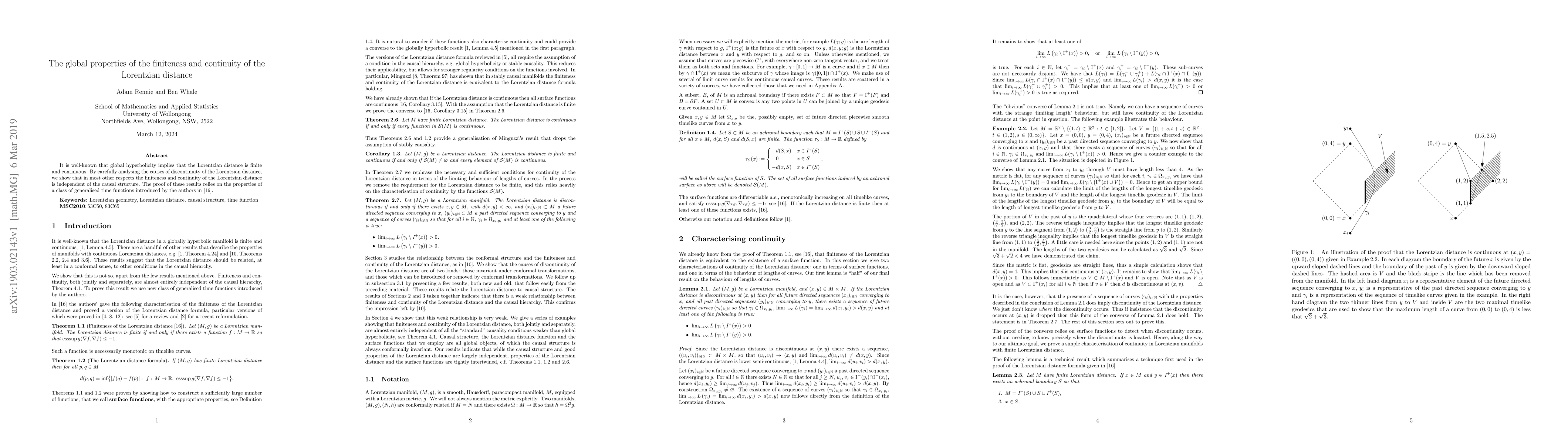This paper explores the global properties of the Lorentzian distance, demonstrating that its finiteness and continuity are largely independent of the causal structure, despite global hyperbolicity typically ensuring these properties. The findings are supported by the analysis of generalised time functions introduced by the authors.