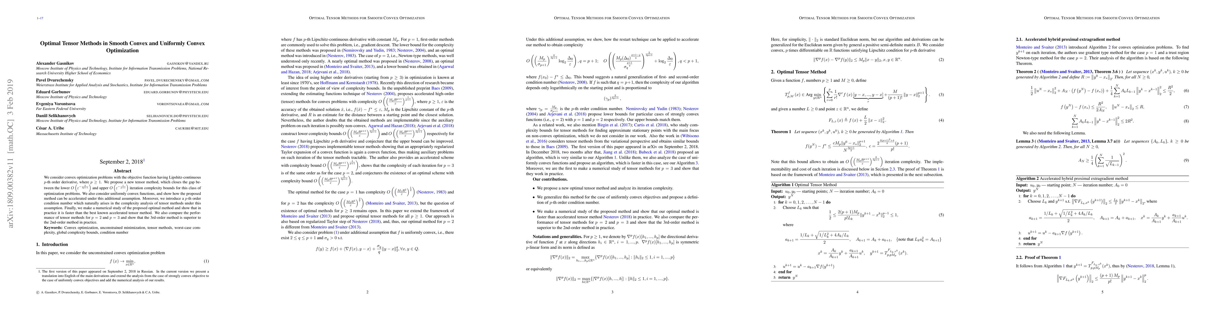 This paper introduces a novel tensor method for convex optimization problems with Lipschitz-continuous higher-order derivatives, achieving near-optimal iteration complexity. The method outperforms existing techniques, especially for higher-order conditions, and practical experiments demonstrate superior performance of the 3rd-order method over the 2nd-order one.