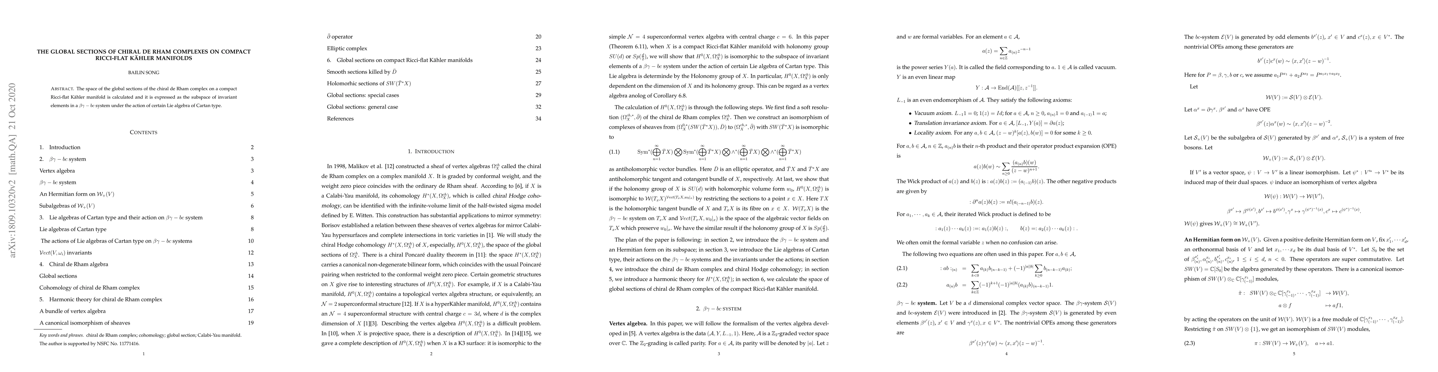 Summary: This paper calculates the global sections of the chiral de Rham complex on compact Ricci-flat Kähler manifolds, expressing them as an invariant subspace of a $\beta\gamma-bc$ system influenced by a specific Lie algebra. The result provides insights into the geometry and topology of these manifolds.