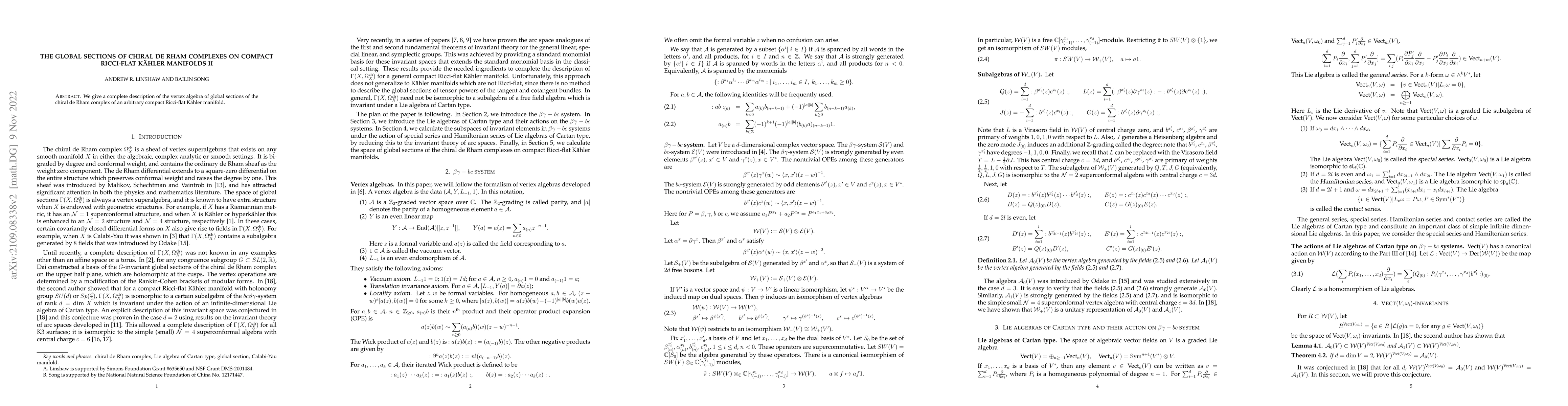 Summary: This paper provides a comprehensive description of the vertex algebra associated with the global sections of the chiral de Rham complex on any compact Ricci-flat Kähler manifold. The study contributes to the understanding of the algebraic structures on such manifolds.