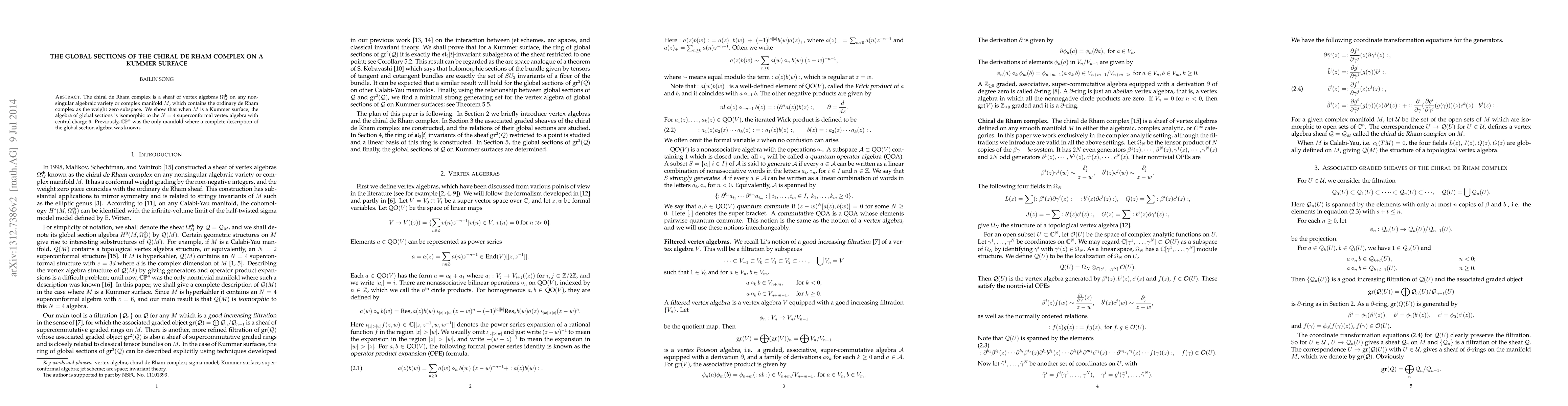 This paper demonstrates that the global sections of the chiral de Rham complex on a Kummer surface are isomorphic to the N = 4 superconformal vertex algebra with central charge 6. This extends the previously known complete description of global sections for CP^n to Kummer surfaces.