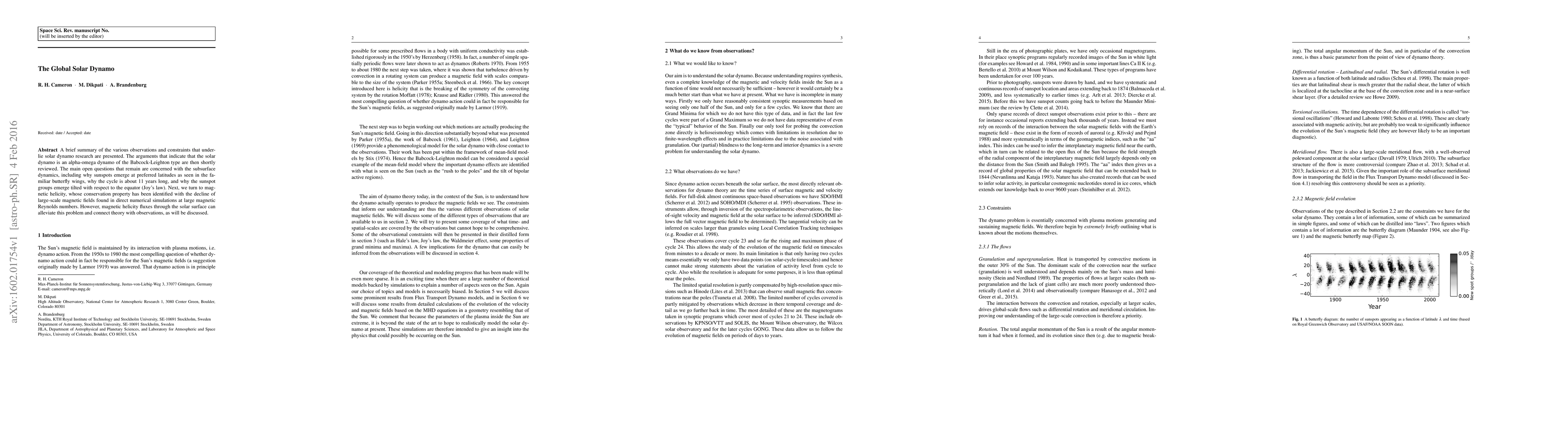 A brief summary of the various observations and constraints that underlie solar dynamo research are presented. The arguments that indicate that the solar dynamo is an alpha-omega dynamo of the Babcock-Leighton type are then shortly reviewed. The main open questions that remain are concerned with the subsurface dynamics, including why sunspots emerge at preferred latitudes as seen in the familiar butterfly wings, why the cycle is about 11 years long, and why the sunspot groups emerge tilted with respect to the equator (Joy's law). Next, we turn to magnetic helicity, whose conservation property has been identified with the decline of large-scale magnetic fields found in direct numerical simulations at large magnetic Reynolds numbers. However, magnetic helicity fluxes through the solar surface can alleviate this problem and connect theory with observations, as will be discussed.