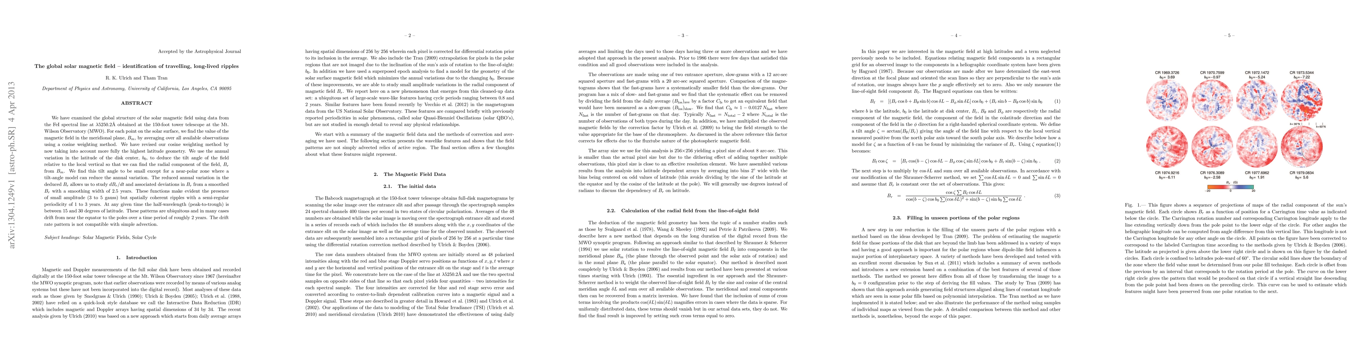 We have examined the global structure of the solar magnetic field using data from the FeI spectral line at {\lambda}5250.2{\AA} obtained at the 150-foot tower telescope at the Mt. Wilson Observatory (MWO). For each point on the solar surface, we find the value of the magnetic field in the meridional plane, Bm, by averaging over all available observations using a cosine weighting method. We have revised our cosine weighting method by now taking into account more fully the highest latitude geometry. We use the annual variation in the latitude of the disk center, b0, to deduce the tilt angle of the field relative to the local vertical so that we can find the radial component of the field, Br from Bm. We find this tilt angle to be small except for a near-polar zone where a tilt-angle model can reduce the annual variation. The reduced annual variation in the deduced Br allows us to study dBr/dt and associated deviations in Br from a smoothed Br with a smoothing width of 2.5 years. These functions make evident the presence of small amplitude (3 to 5 gauss) but spatially coherent ripples with a semi-regular periodicity of 1 to 3 years. At any given time the half-wavelength (peak-to-trough) is between 15 and 30 degrees of latitude. These patterns are ubiquitous and in many cases drift from near the equator to the poles over a time period of roughly 2 years. The drift rate pattern is not compatible with simple advection.