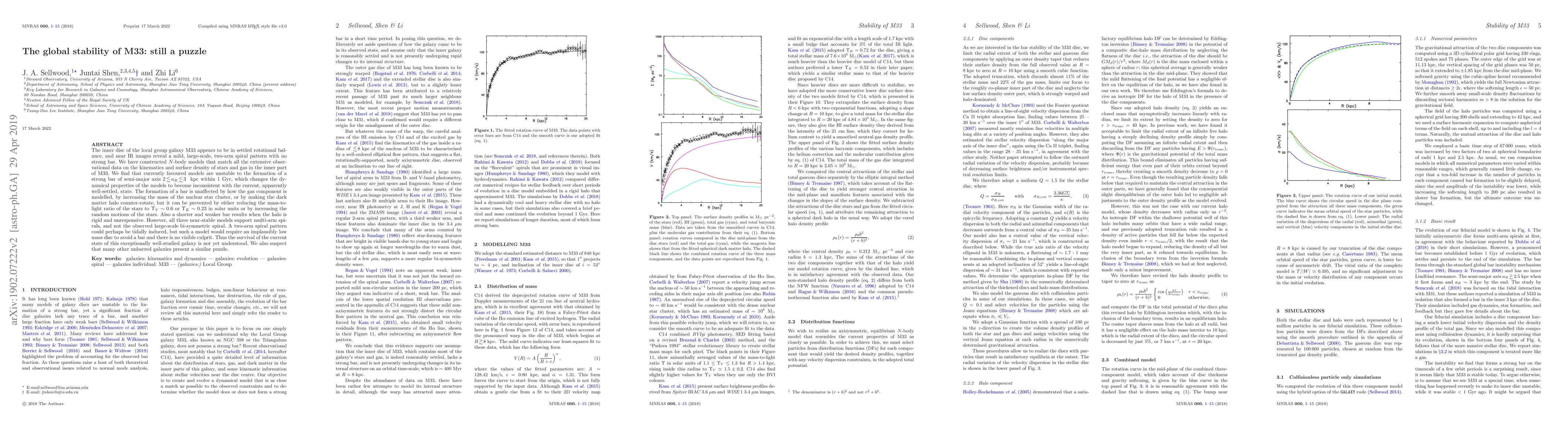 The inner disc of the local group galaxy M33 appears to be in settled rotational balance, and near IR images reveal a mild, large-scale, two-arm spiral pattern with no strong bar. We have constructed N-body models that match all the extensive observational data on the kinematics and surface density of stars and gas in the inner part of M33. We find that currently favoured models are unstable to the formation of a strong bar of semi-major axis 2 < a_B < 3 kpc within 1 Gyr, which changes the dynamical properties of the models to become inconsistent with the current, apparently well-settled, state. The formation of a bar is unaffected by how the gas component is modelled, by increasing the mass of the nuclear star cluster, or by making the dark matter halo counter-rotate, but it can be prevented by either reducing the mass-to-light ratio of the stars to Upsilon_V ~ 0.6 or Upsilon_K ~ 0.23 in solar units or by increasing the random motions of the stars. Also a shorter and weaker bar results when the halo is rigid and unresponsive. However, all three near-stable models support multi-arm spirals, and not the observed large-scale bi-symmetric spiral. A two-arm spiral pattern could perhaps be tidally induced, but such a model would require an implausibly low mass disc to avoid a bar and there is no visible culprit. Thus the survival of the current state of this exceptionally well-studied galaxy is not yet understood. We also suspect that many other unbarred galaxies present a similar puzzle.