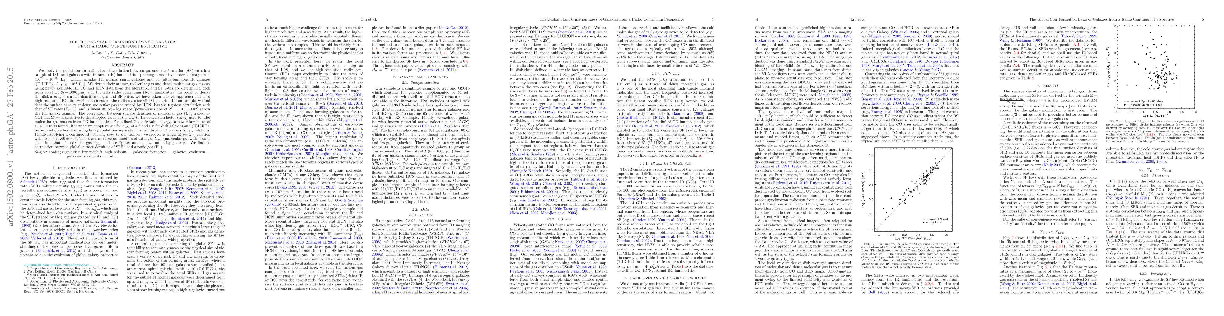 We study the global SF law - the relation between gas and SFRs in a sample of 181 local galaxies with L_IR spanning almost five orders of magnitude, which includes 115 normal galaxies and 66 (U)LIRGs. We derive their atomic, molecular gas and dense molecular gas masses using newly available HI, CO and HCN data from the literature, and SFRs are determined both from total IR and 1.4 GHz radio continuum (RC) luminosities. In order to derive the disk-averaged surface densities of gas and SFRs, we have used high-resolution RC observations to measure the radio sizes for all galaxies. We find that dense molecular gas (as traced by HCN) has the tightest correlation with that of SFRs, and is linear in (N=1.01 +/- 0.02) across the full galaxy sample. The correlation between densities of molecular gas (traced by CO) and SFRs is sensitive to the adopted value of the alpha_CO used to infer molecular gas masses from CO luminosities. For a fixed value of alpha_CO, a slope of 1.14+/-0.02 is found. If instead we adopt values of 4.6 and 0.8 for disk galaxies and (U)LIRGs, respectively, we find the two distinct relations. If applying a continuously varying alpha_CO to our sample, we recover a single relation with slope of 1.60+/-0.03. The SFRs is a steeper function of total gas than that of molecular gas, and is tighter among low-luminosity galaxies. We find no correlation between SFRs and atomic gas.