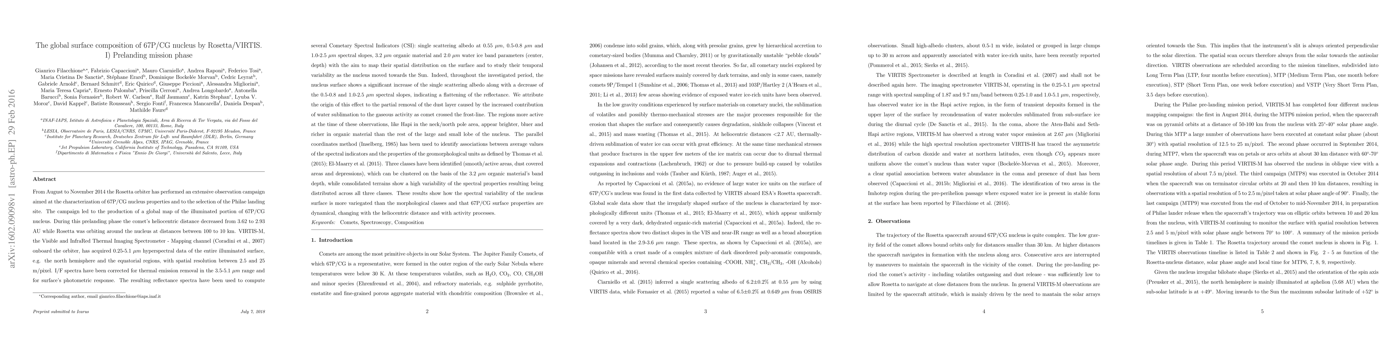 Researchers mapped 67P/CG comet nucleus using Rosetta/VIRTIS instrument, revealing changes in its surface composition as it approached the Sun, including a decrease in dust layer and increase in water sublimation.
