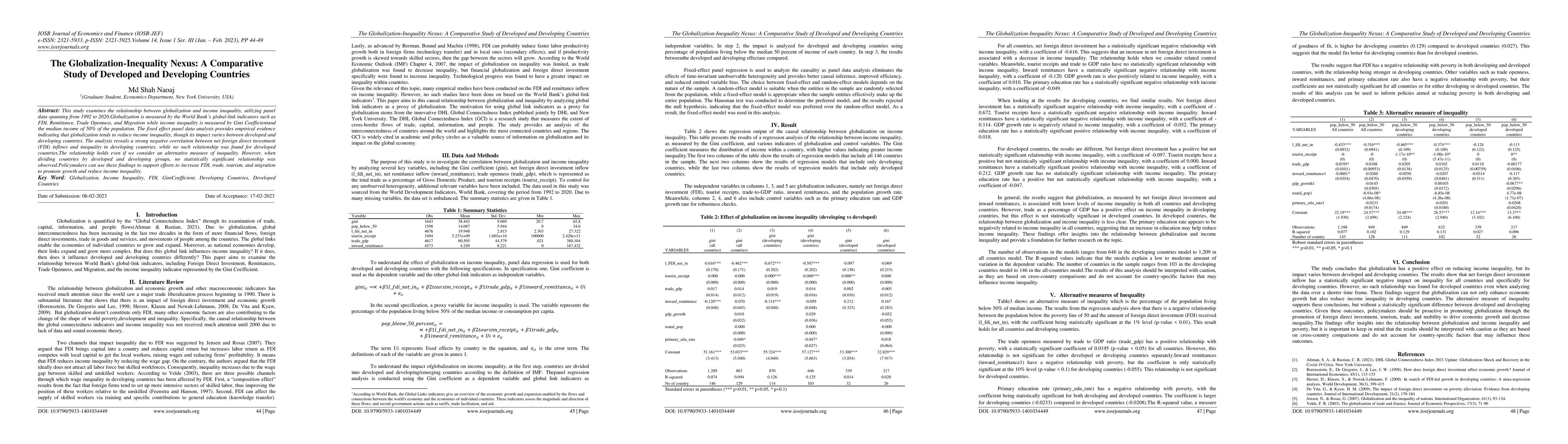 This study finds that globalization generally reduces income inequality, with FDI inflows strongly correlating to lower inequality in developing countries, while no such effect is observed in developed countries. Policymakers may leverage FDI, trade, and migration to promote economic growth and reduce inequality.
