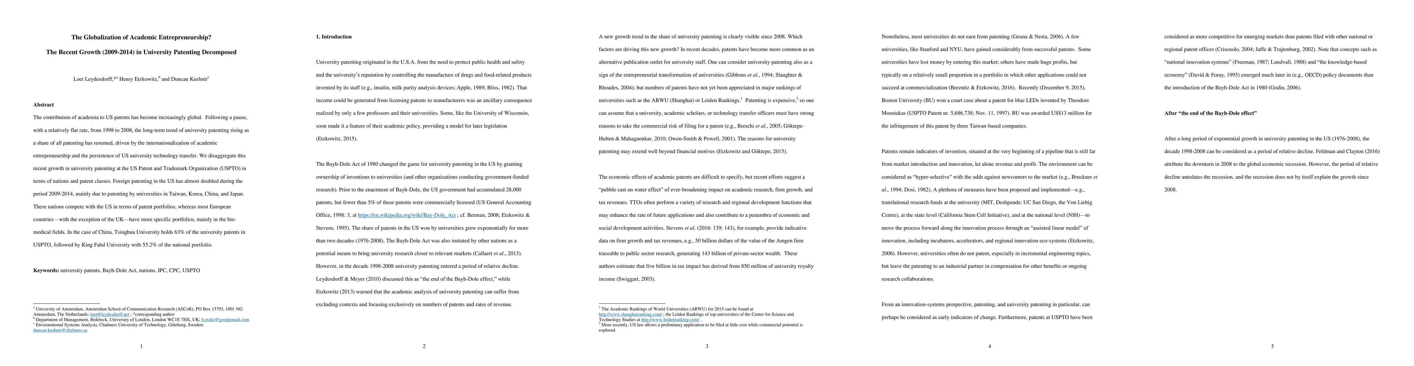 This paper examines the resurgence of university patenting in the US from 2009-2014, highlighting the global trend of academic entrepreneurship, particularly from Taiwan, Korea, China, and Japan. It notes that these countries now compete with the US in patent portfolios, while European nations, except the UK, focus more on bio-medical patents.