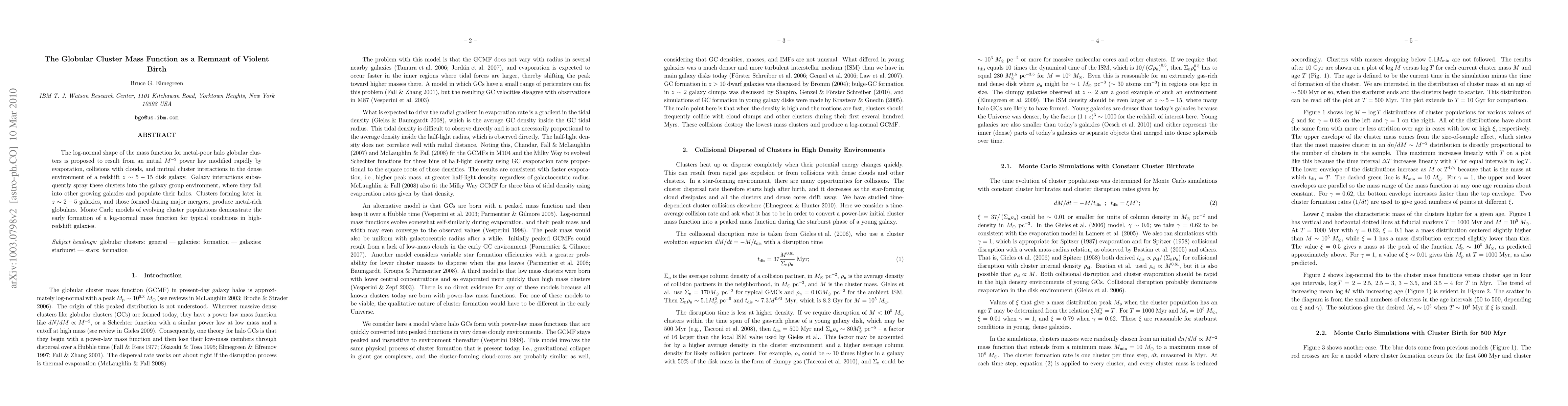 The log-normal shape of the mass function for metal-poor halo globular clusters is proposed to result from an initial M^{-2} power law modified rapidly by evaporation, collisions with clouds, and mutual cluster interactions in the dense environment of a redshift z~5-15 disk galaxy. Galaxy interactions subsequently spray these clusters into the galaxy group environment, where they fall into other growing galaxies and populate their halos. Clusters forming later in z~2-5 galaxies, and those formed during major mergers, produce metal-rich globulars. Monte Carlo models of evolving cluster populations demonstrate the early formation of a log-normal mass function for typical conditions in high-redshift galaxies.