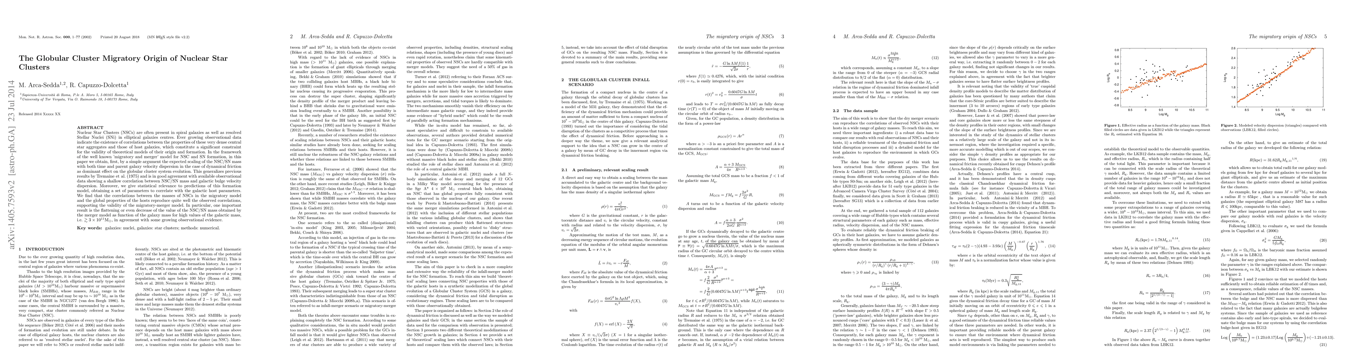 Nuclear Star Clusters (NSCs) are often present in spiral galaxies as well as resolved Stellar Nuclei (SNi) in elliptical galaxies centres. Ever growing observational data indicate the existence of correlations between the properties of these very dense central star aggregates and those of host galaxies, which constitute a significant constraint for the validity of theoretical models of their origin and formation. In the framework of the well known 'migratory and merger' model for NSC and SN formation, in this paper we obtain, first, by a simple argument the expected scaling of the NSC/SN mass with both time and parent galaxy velocity dispersion in the case of dynamical friction as dominant effect on the globular cluster system evolution. This generalizes previous results by \cite{TrOsSp} and is in good agreement with available observational data showing a shallow correlation between NSC/SN mass and galactic bulge velocity dispersion. Moreover, we give statistical relevance to predictions of this formation model, obtaining a set of parameters to correlate with the galactic host parameters. We find that the correlations between the masses of NSCs in the migratory model and the global properties of the hosts reproduce quite well the observed correlations, supporting the validity of the migratory-merger model. In particular, one important result is the flattening or even decrease of the value of the NSC/SN mass obtained by the merger model as function of the galaxy mass for high values of the galactic mass, i.e. $\gtrsim 3\times 10^{11}$M$_\odot$, in agreement with some growing observational evidence.